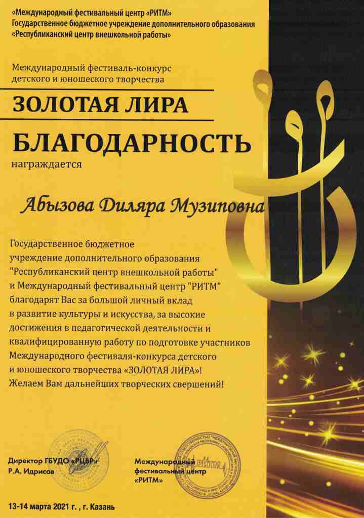 Международный фестиваль-конкурс "Хрустальное сердце мира" - Благодарность Гиниятуллиной Л.А.;