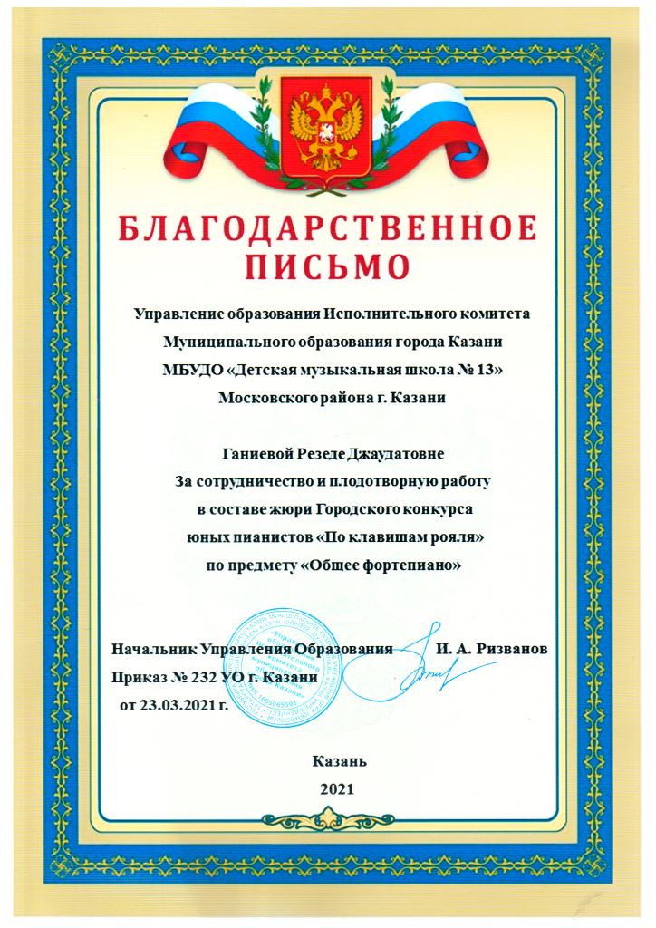 Первый Международный конкурс "Московский рубеж" - Благодарность Ганиевой Р.Д.;
