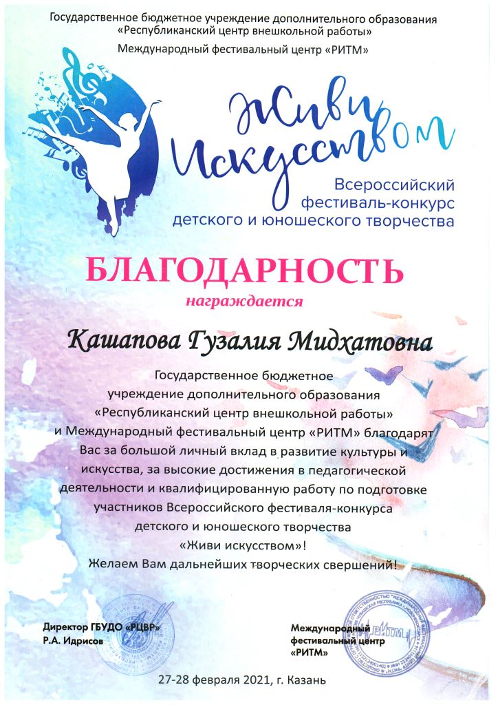 Международный конкурс искусств "Кубок РИТМа" - Благодарность Кашаповой Г.М.;
