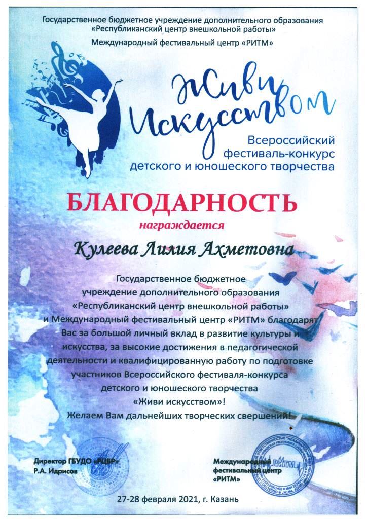Всероссийский конкурс искусств "Территория творчества" - Благодарность Файзрахмановой Л.Ш.;