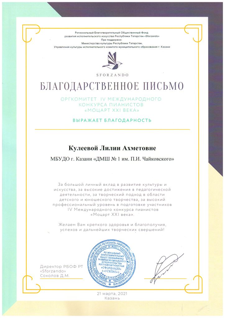 IV Международный конкурс пианистов "Моцарт XXI века" - Благодарность Кулеевой Л.А.;