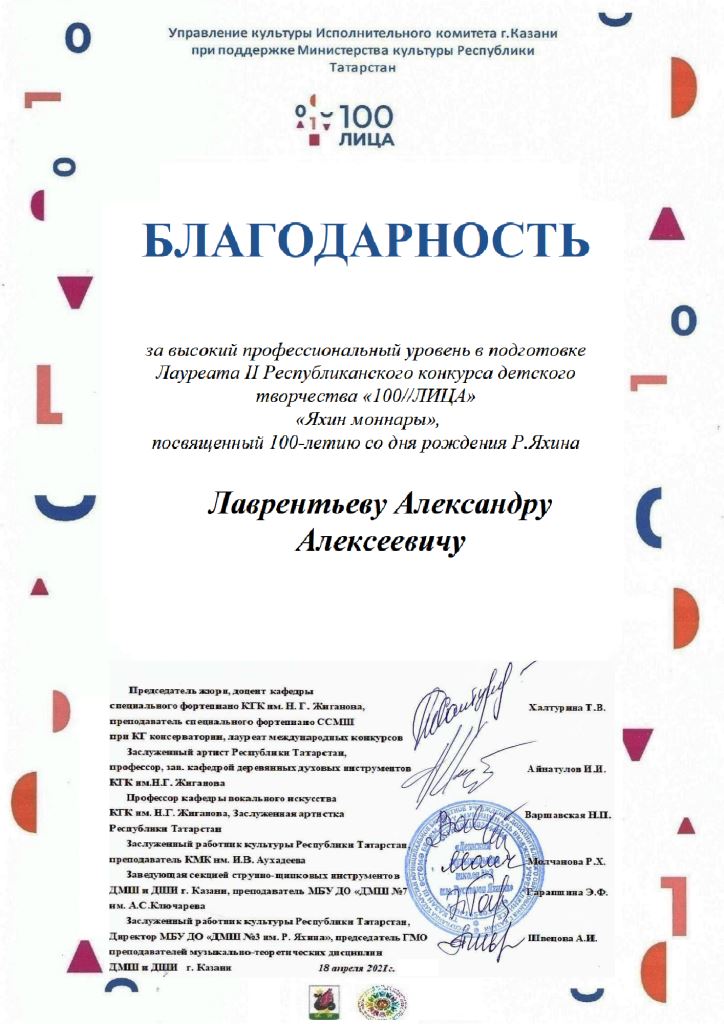 Международный конкурс-фестиваль "NEXT. Поколение - 2021" - Благодарность Лаврентьевой А.И.;