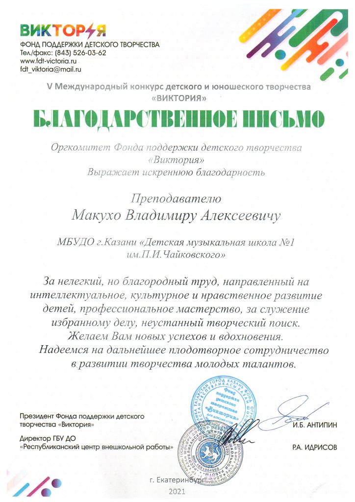 V Международный конкурс детского и юношеского творчества "Виктория" - Благодарность Макухо В.А.;