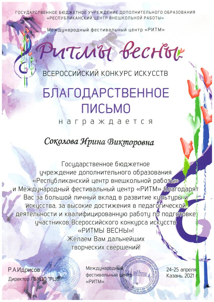 Всероссийский конкурс искусств "Ритмы весны" - Благодарность Соколовой И.В.;