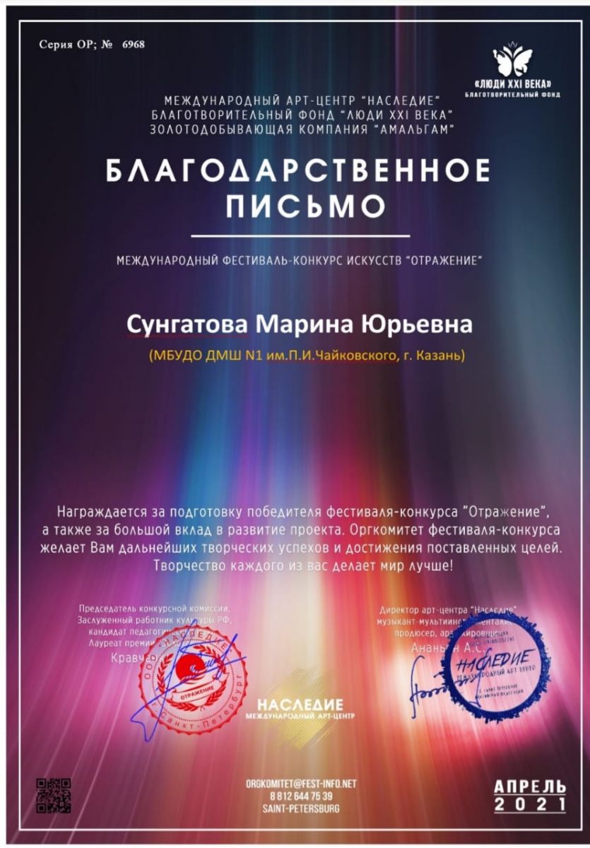 Международный фестиваль-конкурс искусств "Отражение" - Благодарность Сунгатовой М.Ю.;