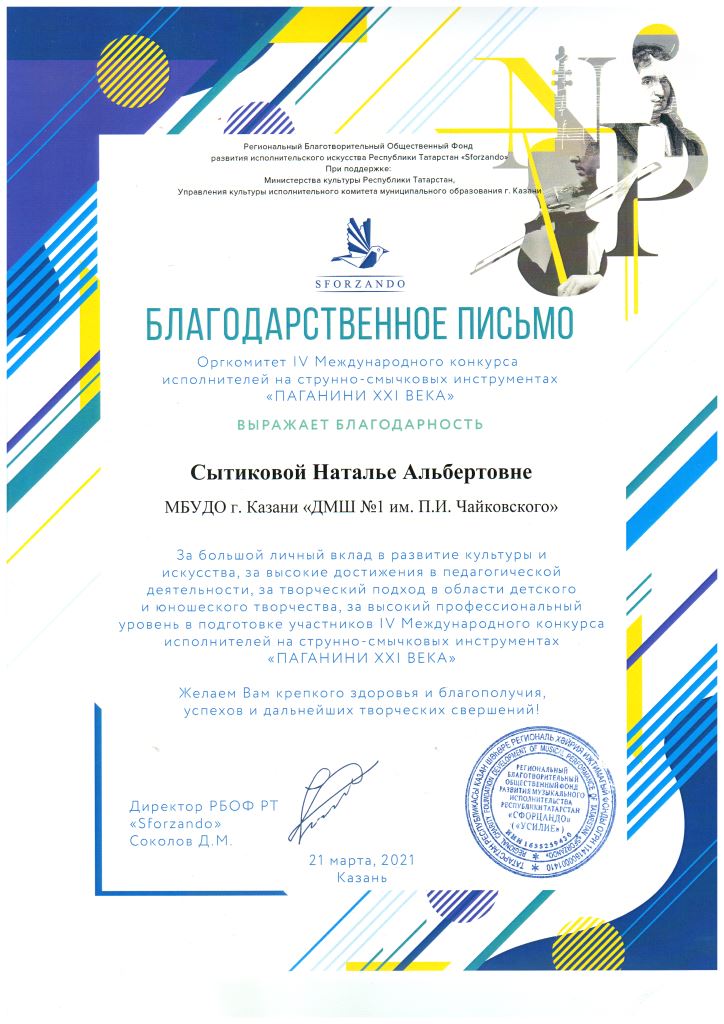 Администрация МБУДО "Нурлатская детская школа искусств" - Благодарность Сытиковой Н.А.;