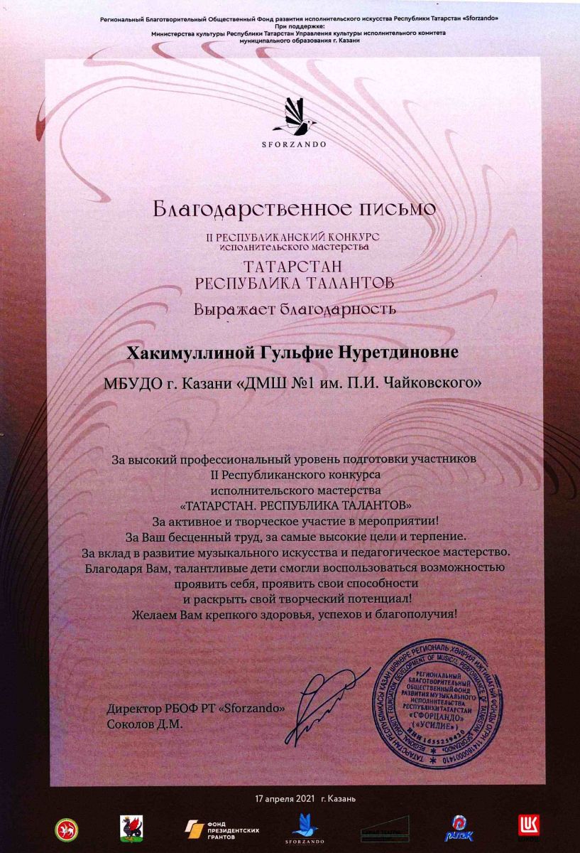 VI Республиканский конкурс исполнительского искусства "Forte" - Благодарность Мардановой Г.Р.;