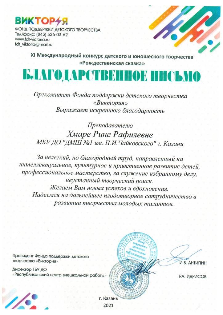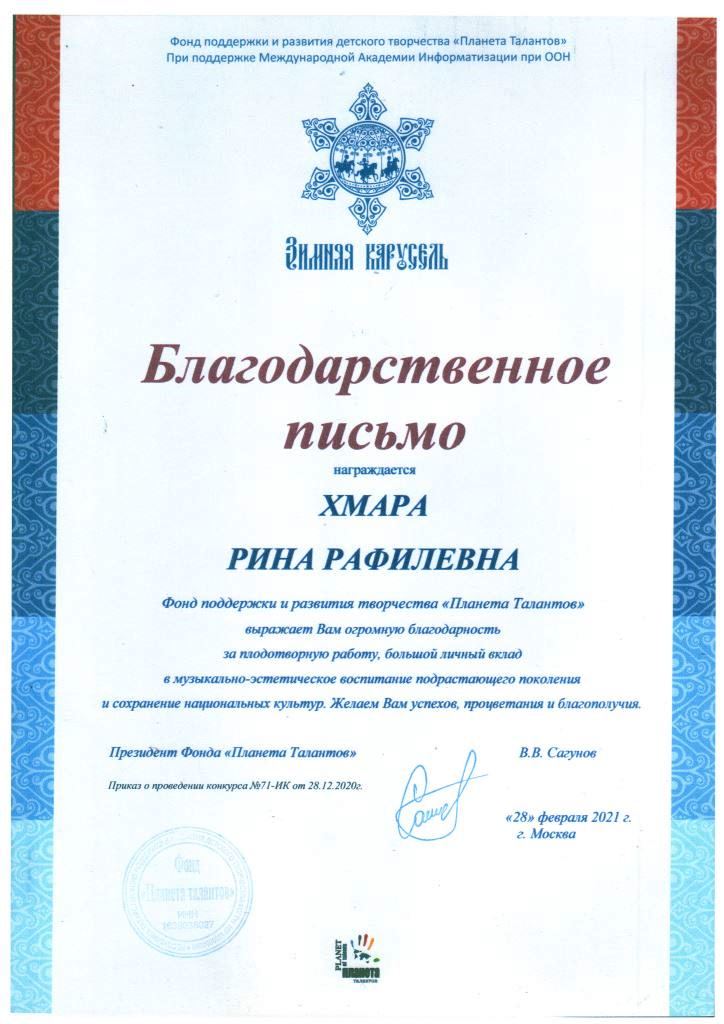 Международный фестиваль "Зимняя карусель" - Благодарность Хмаре Р.Р.;