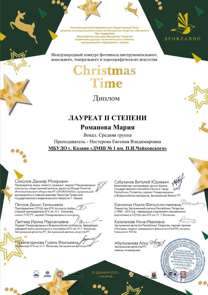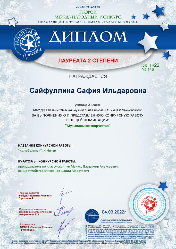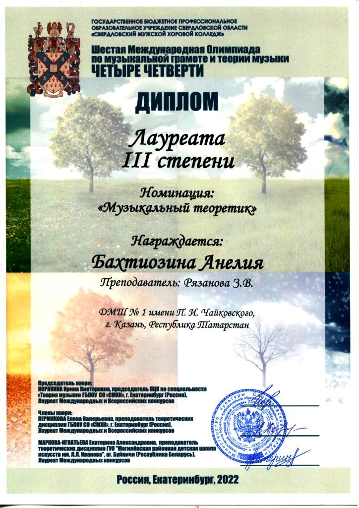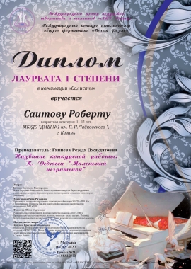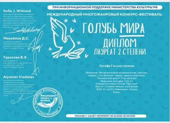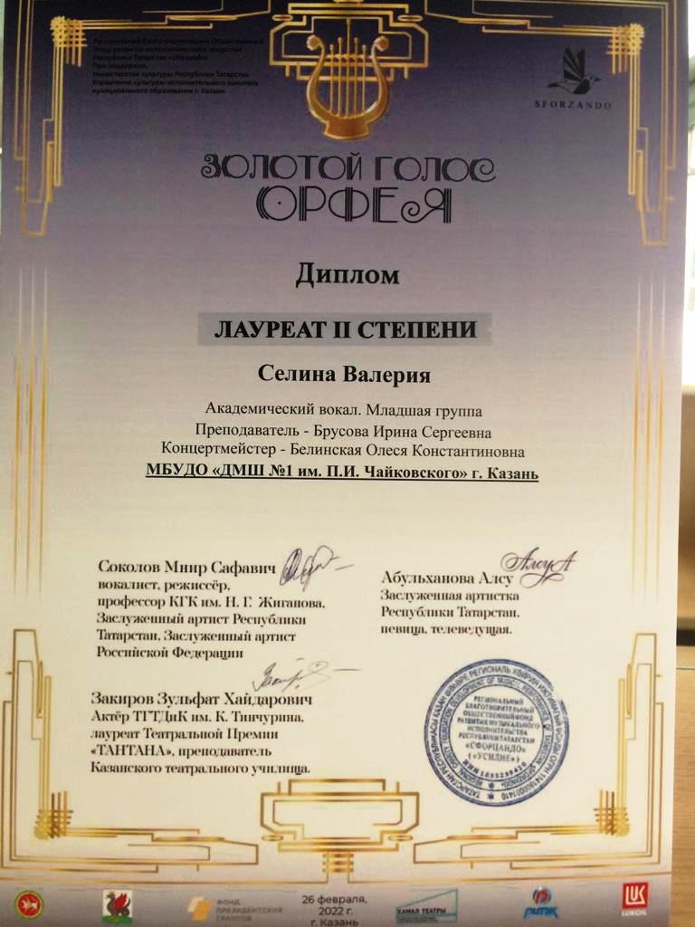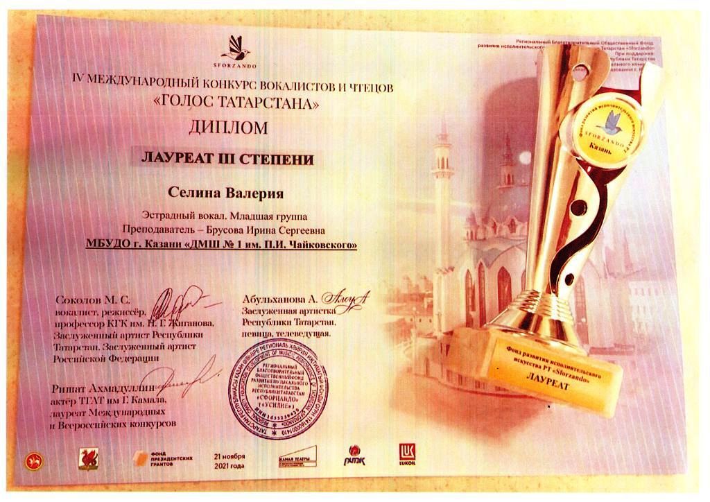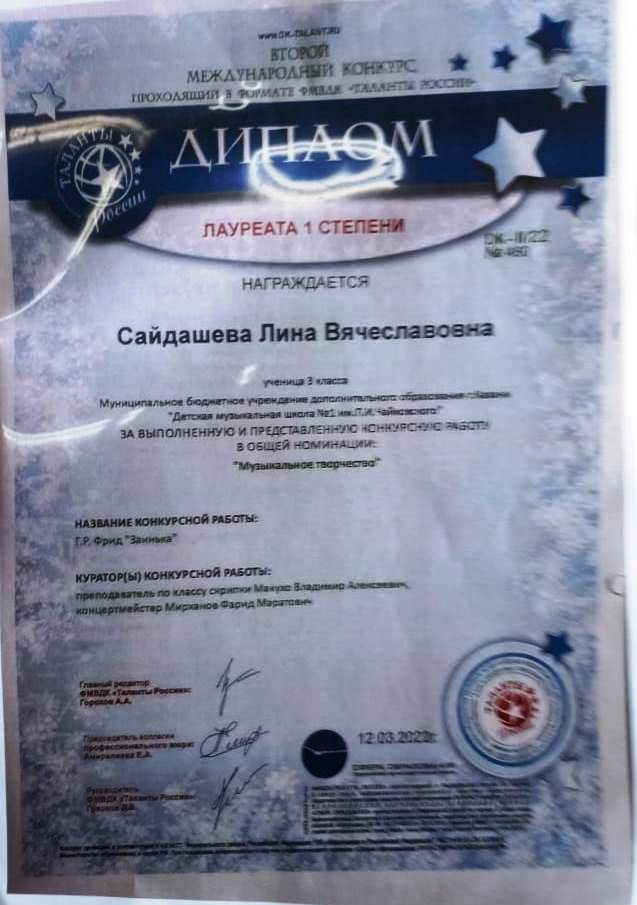 IV Международный фестиваль-конкурс хорового искусства, академического вокала и инструментального исполнительства "Серебряные росы" - Сайдашева Лина, Лауреат II степени, класс Макухо В.А., концертмейстер Мирханов Ф.М.;