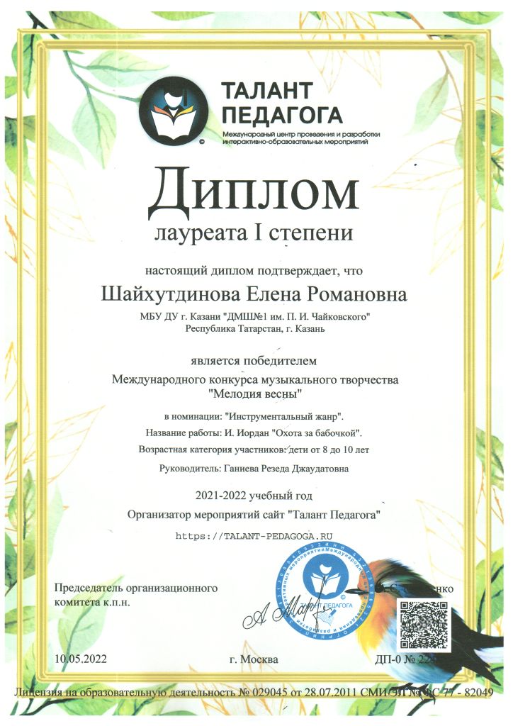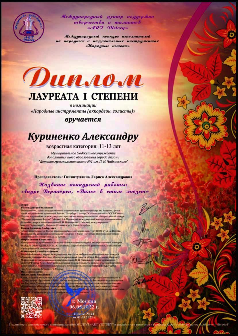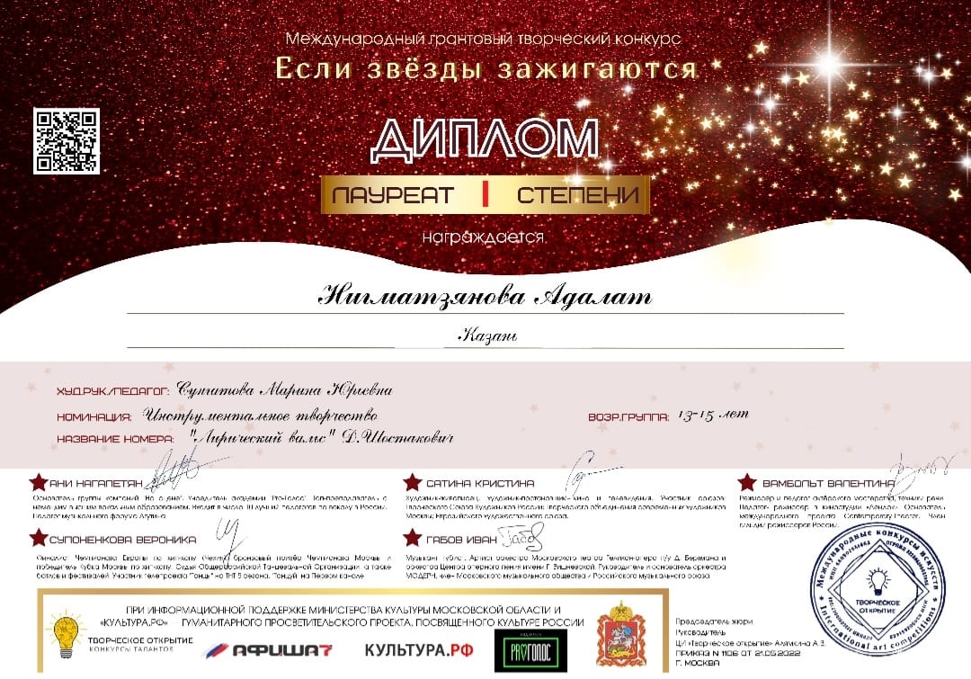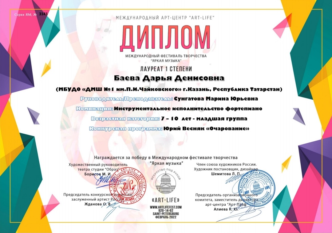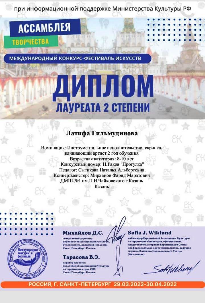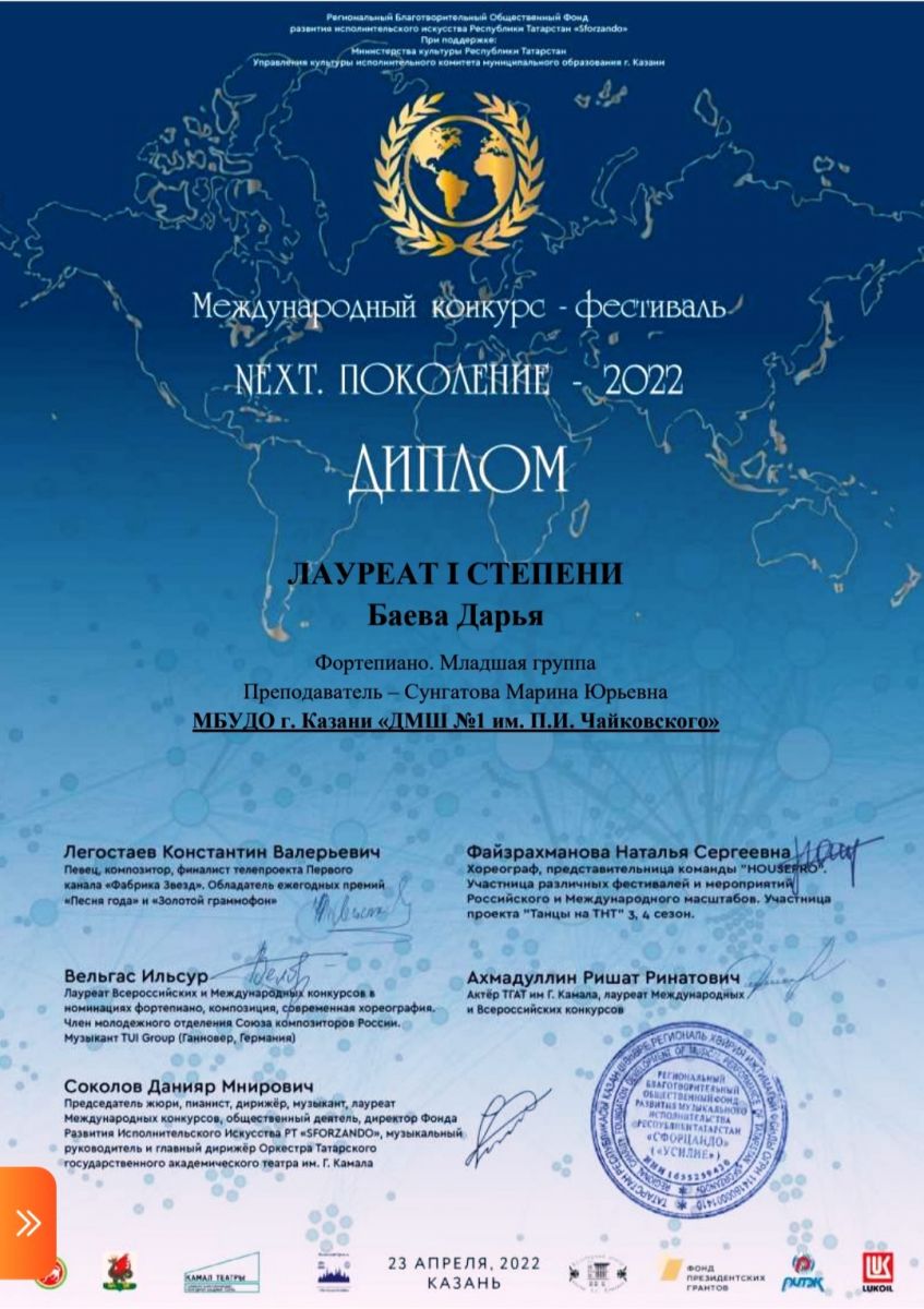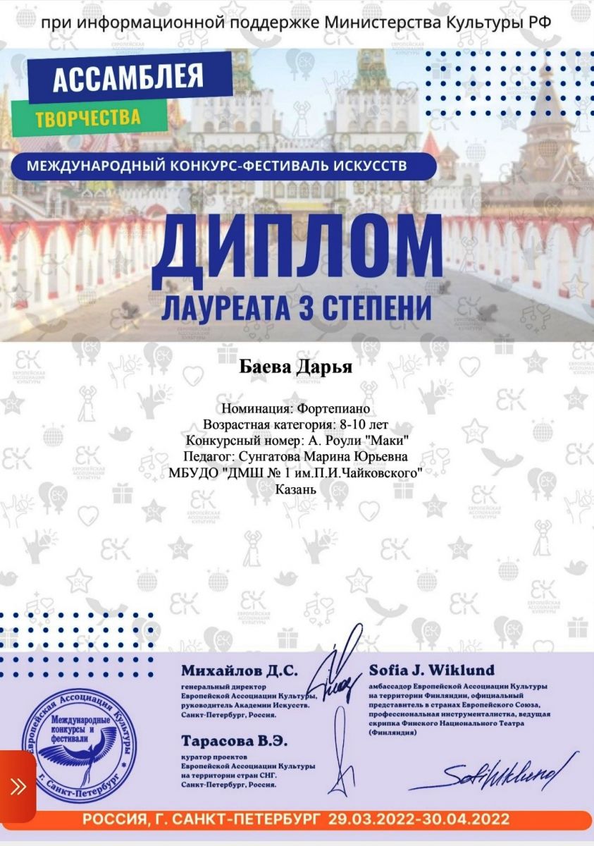 V Международный конкурс "Гордость России" - Баева Дарья, Лауреат I степени, класс Сунгатовой М.Ю.;