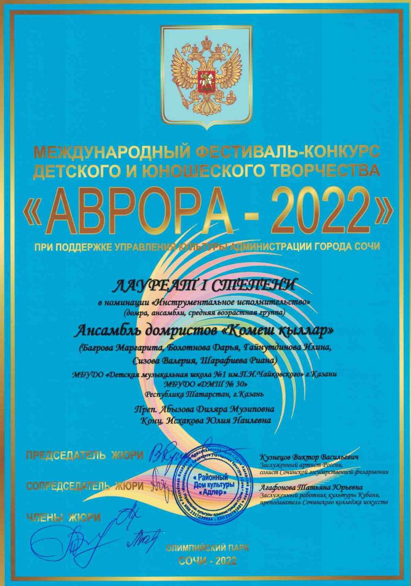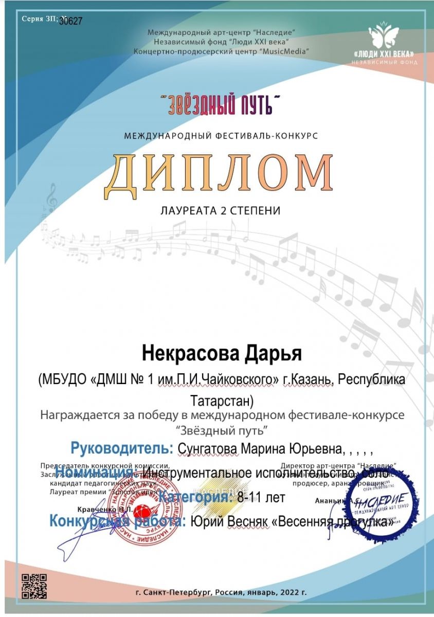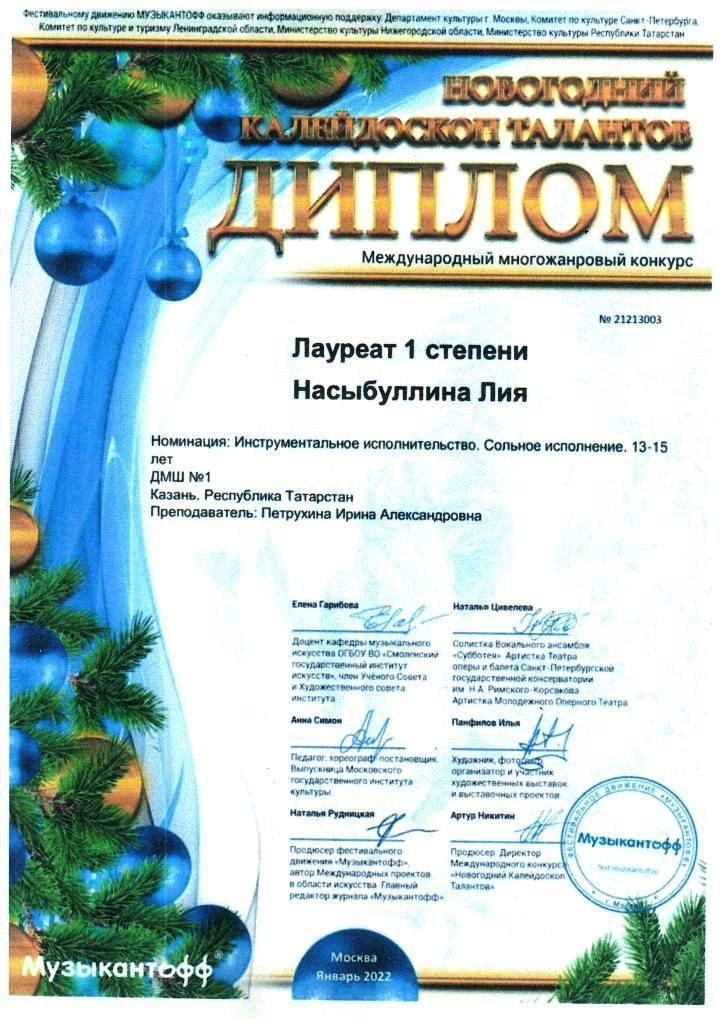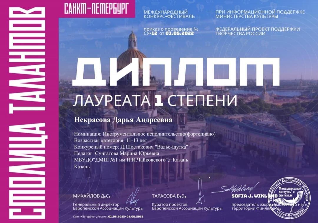 Международный конкурс "Синяя птица" - Некрасова Дарья, I место, класс Сунгатовой М.Ю.;