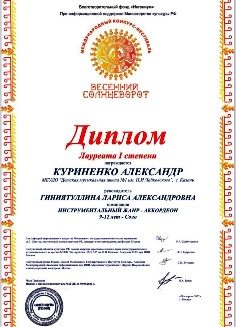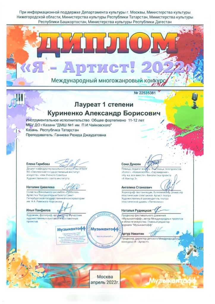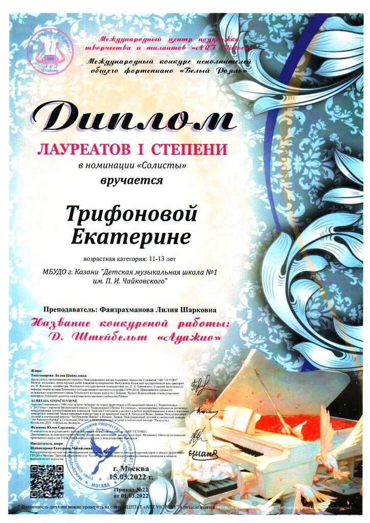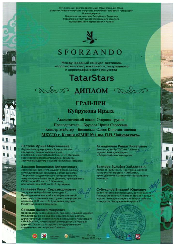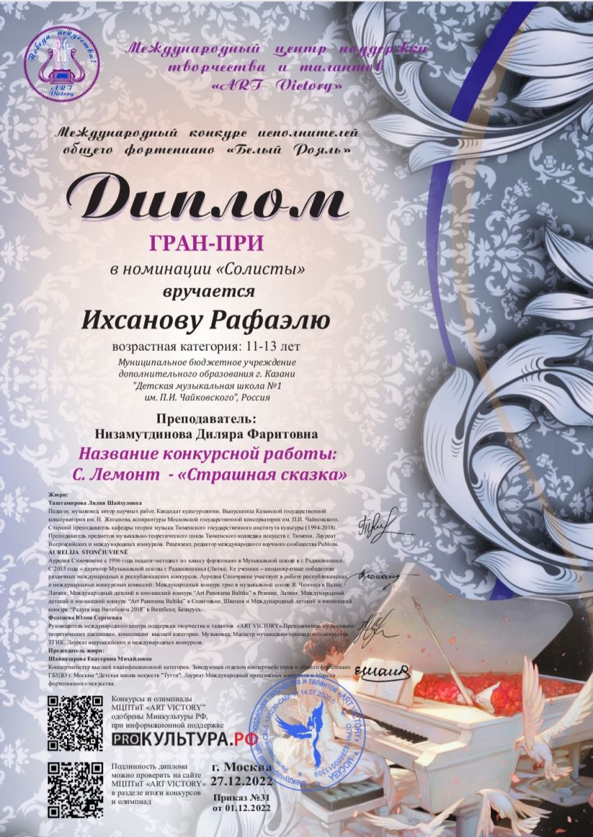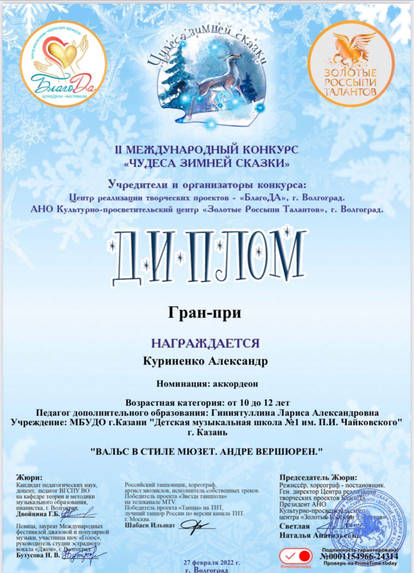 Международный конкурс искусств "Золотой рояль" - Груйич Катерина, Гран-при, класс Кашаповой Г.М.;