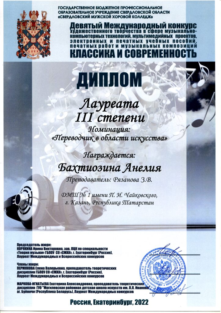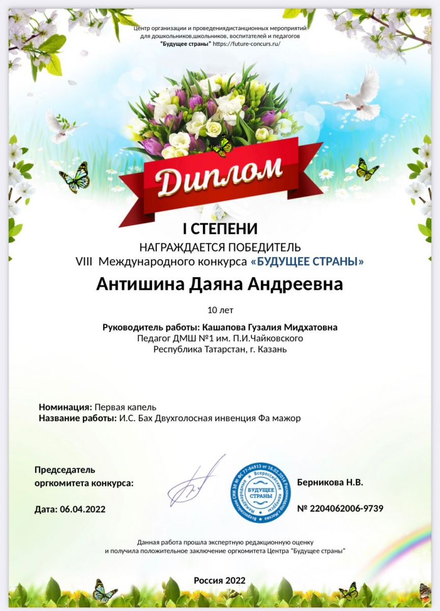 Международный конкурс "Синяя птица" - Баева Дарья, I место, класс Сунгатовой М.Ю.;