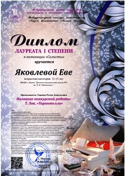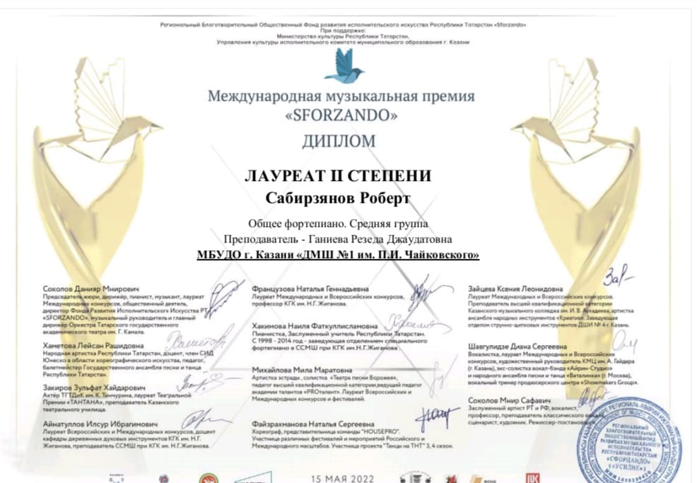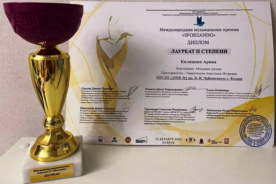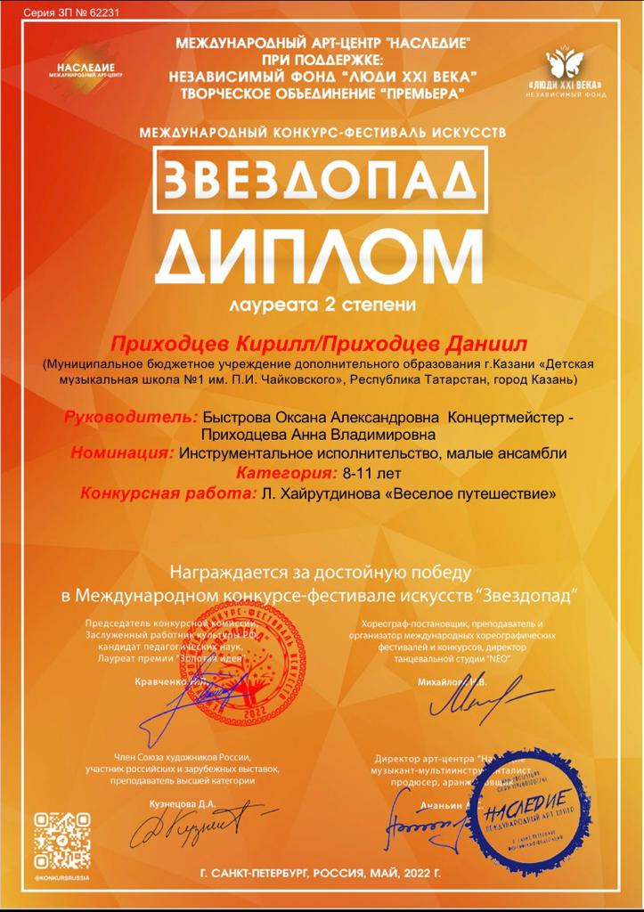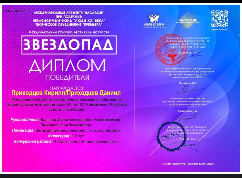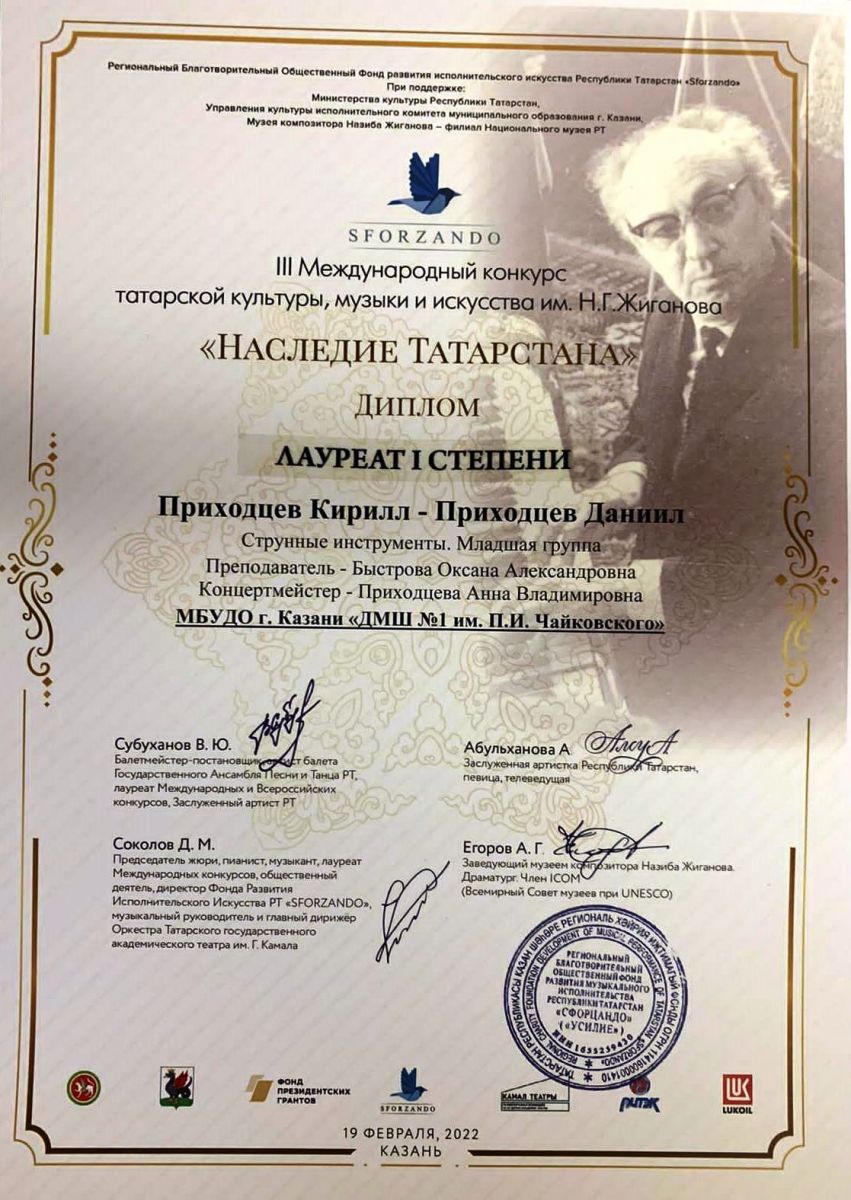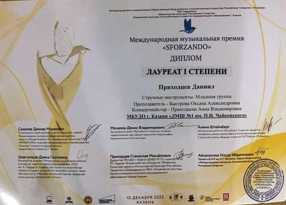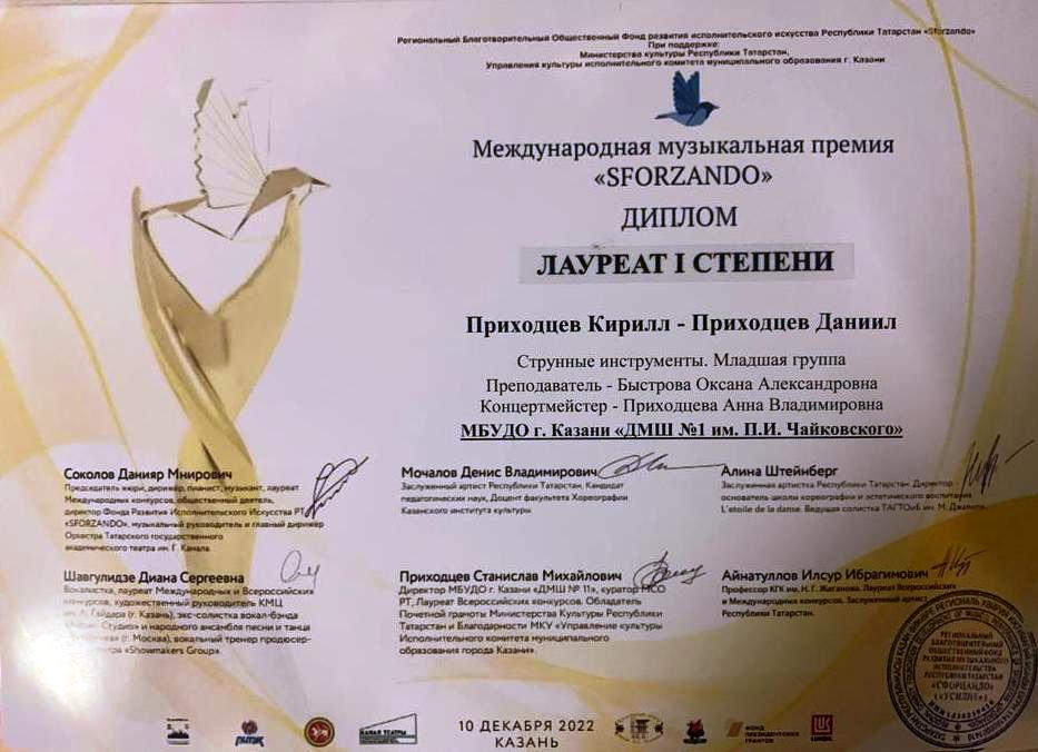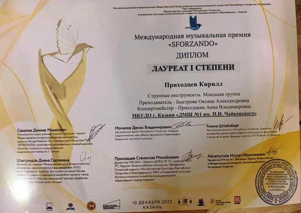 Международная музыкальная премия "SFORZANDO" - Приходцев К. Лауреат I степени, класс Быстровой О.А.;