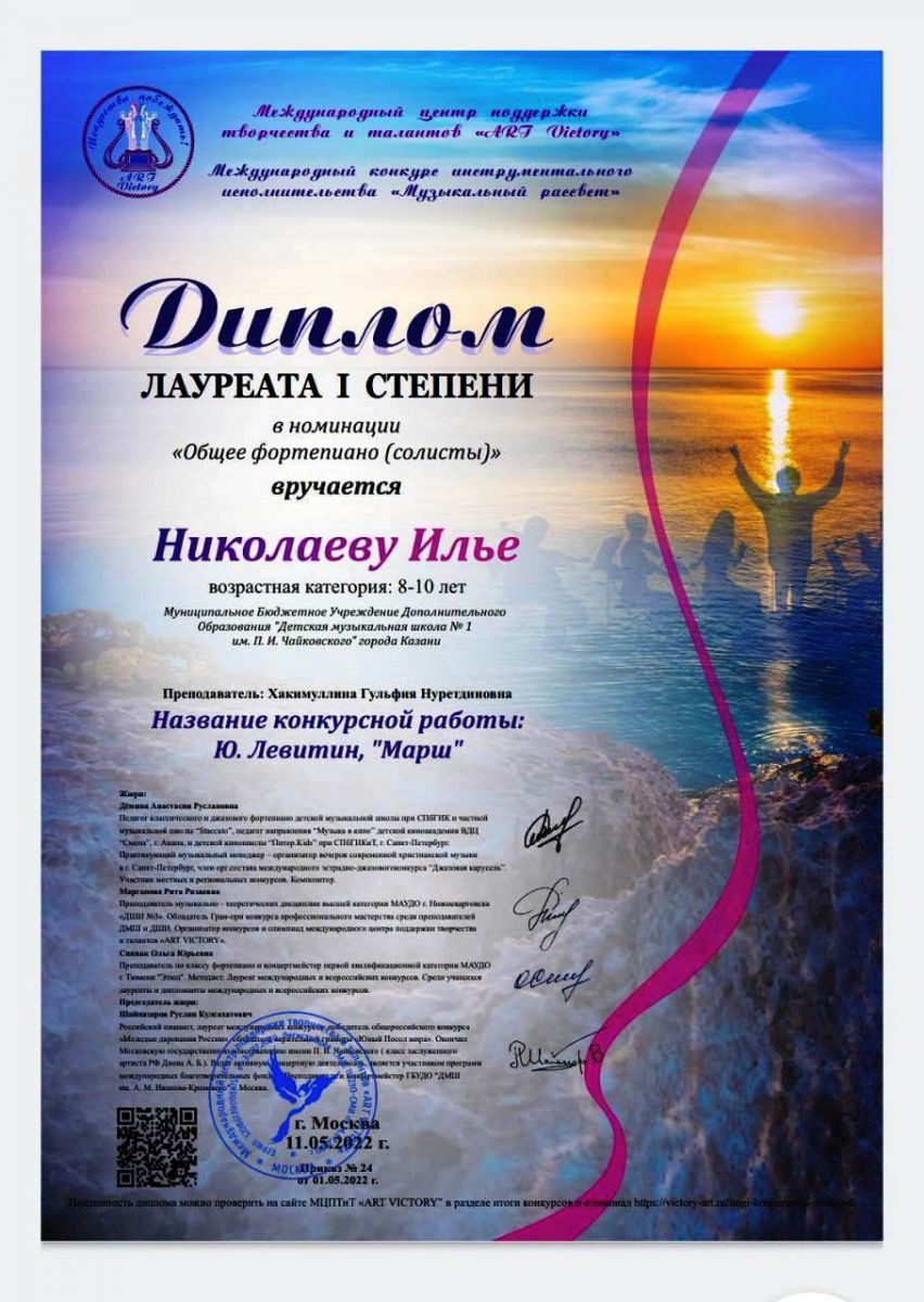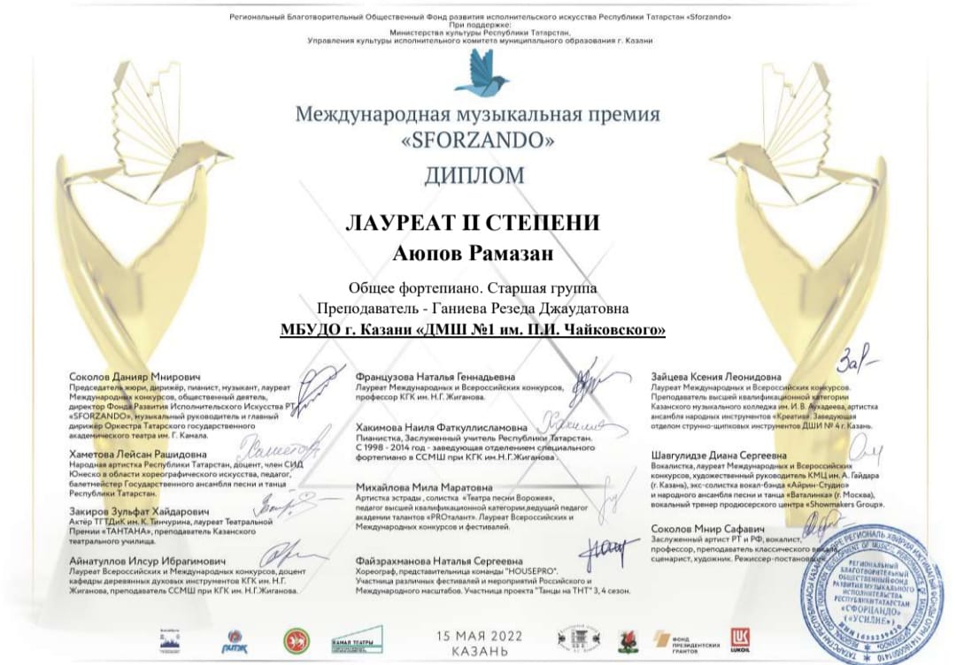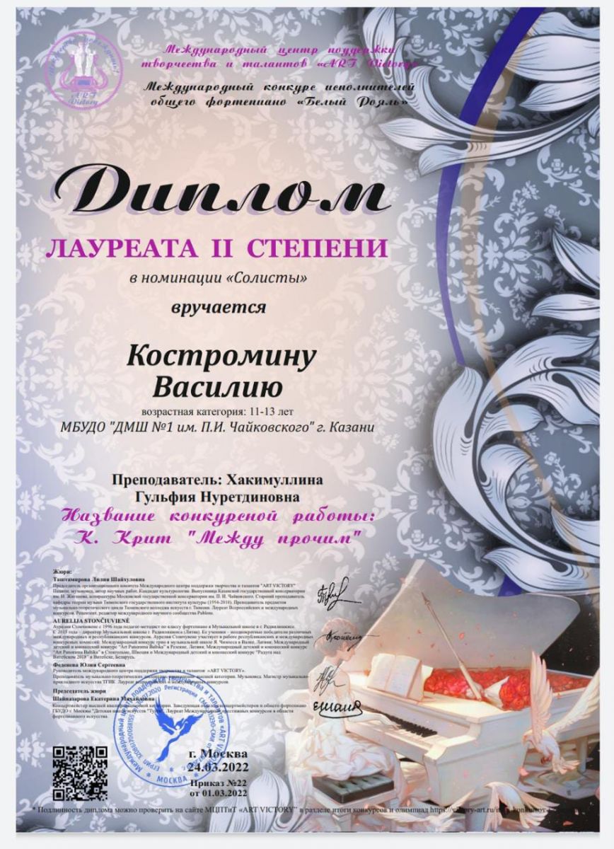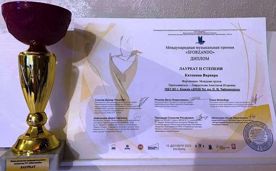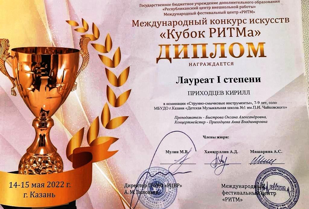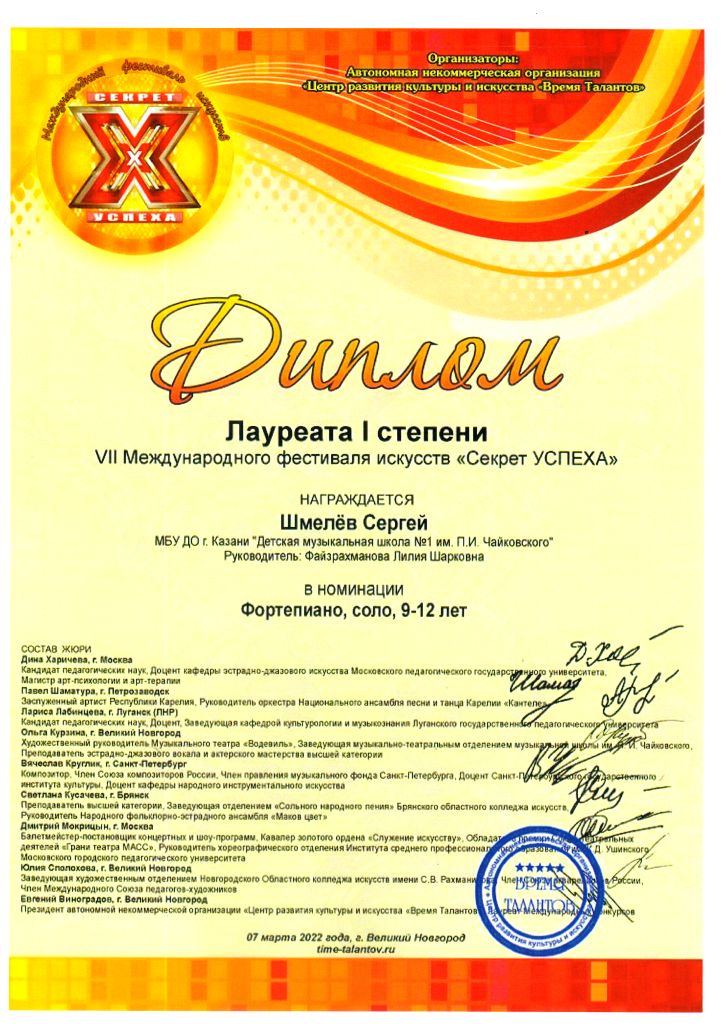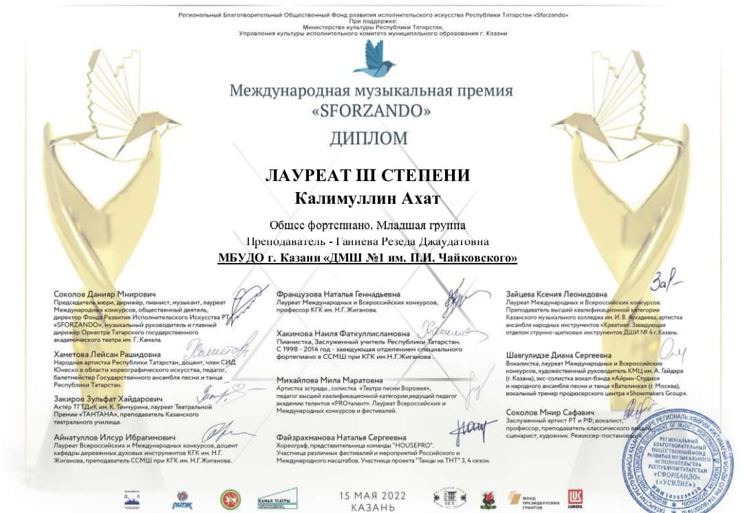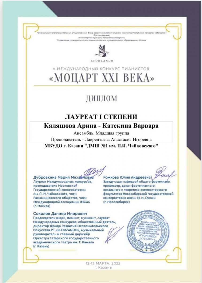 Международная музыкальная премия "SFORZANDO" - Приходцев К. Лауреат I степени, класс Быстровой О.А.;