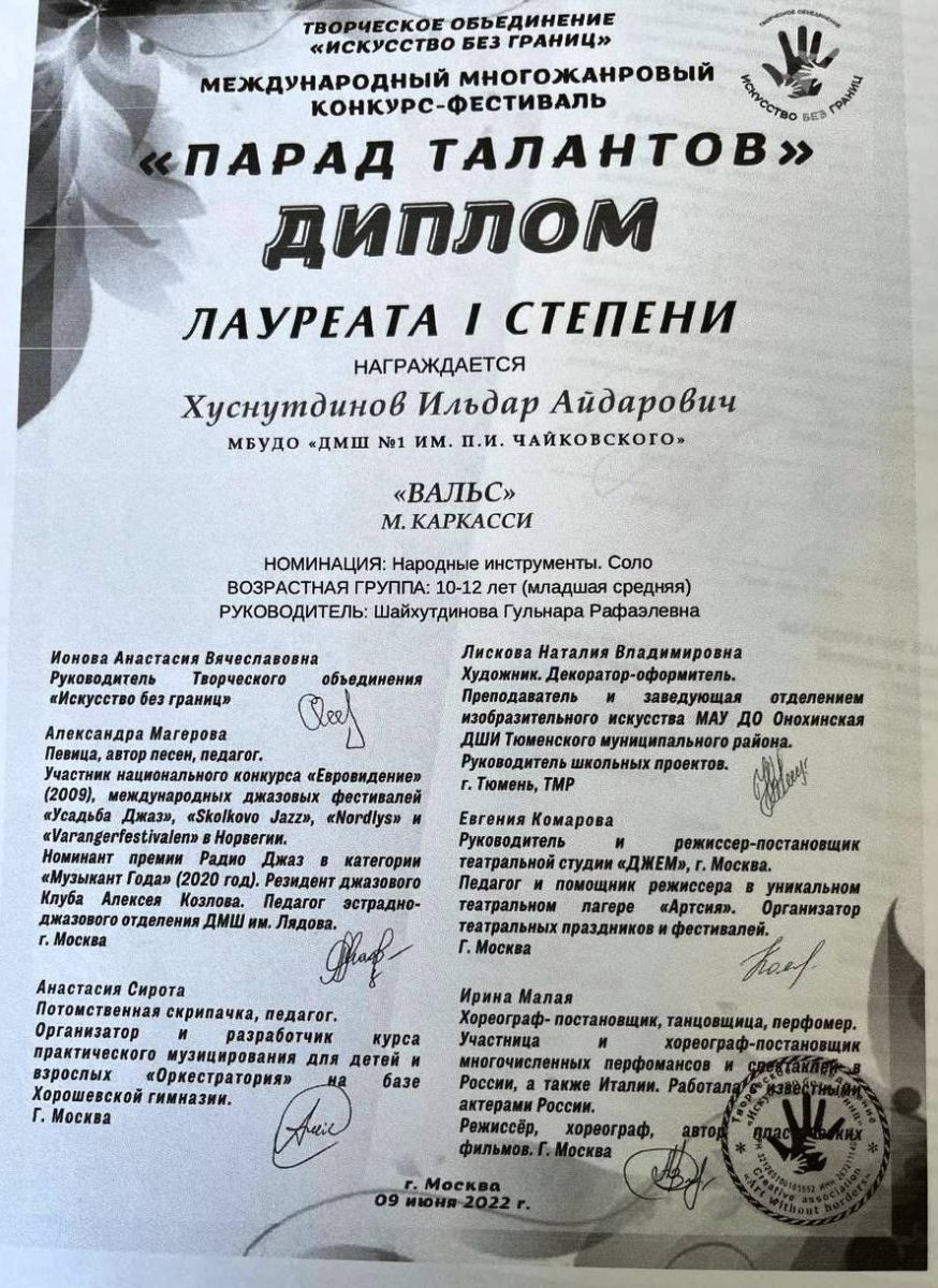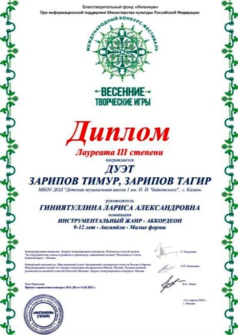 Международный фестиваль-конкурс "Арт-магия" - Дуэт Осипов Владимир и Безденежных Михаил, Победитель, клаксс Шайхутдиновой Г.Р. и Гришина А.В.;