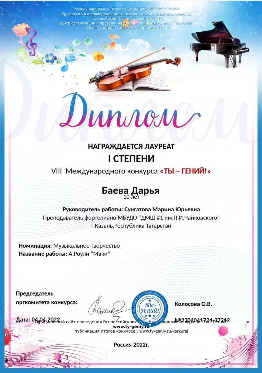 VIII Международный конкурс "Ты - гений" - Баева Дарья, Лауреат I степени, класс Сунгатовой М.Ю.;