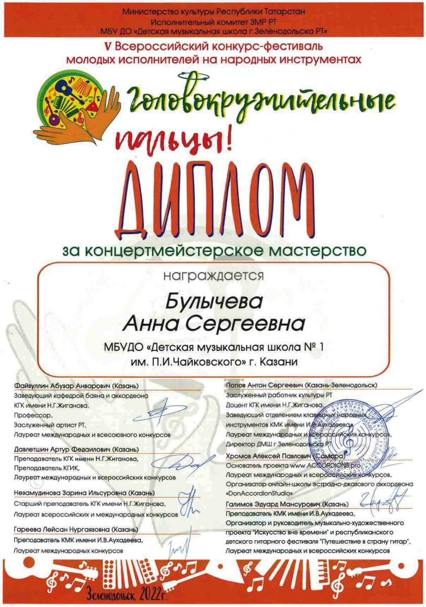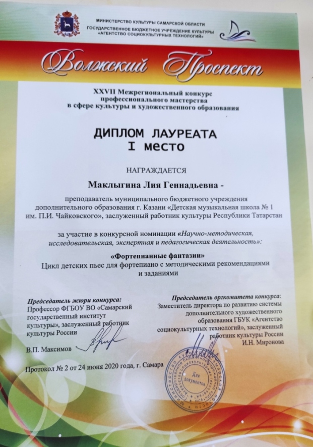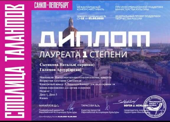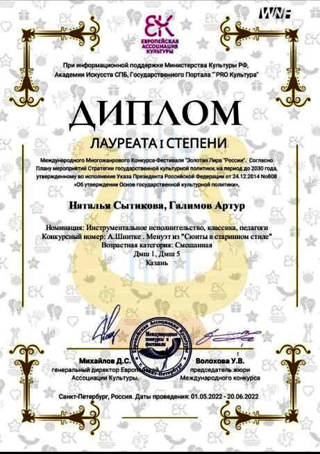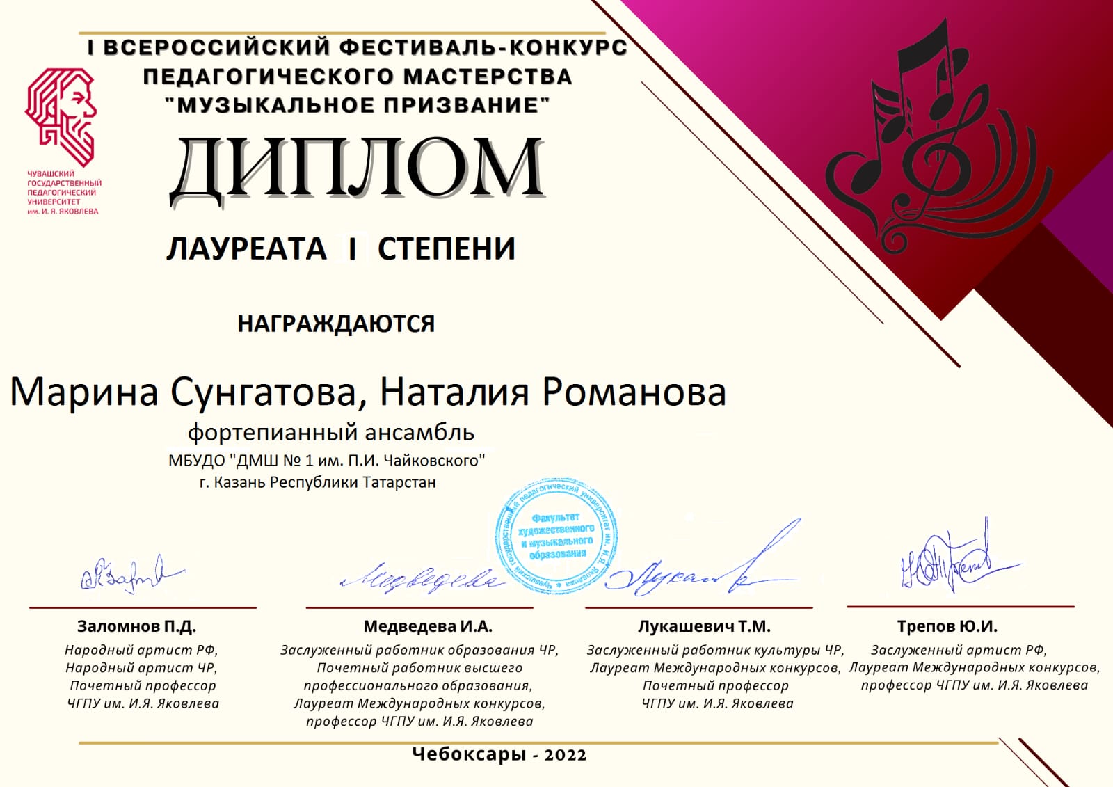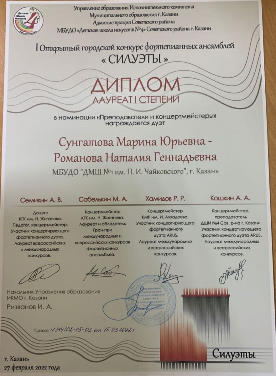 Международный конкурс концертмейстеров "Маэстро" - Сунгатова М.Ю., Лауреат I степени;
