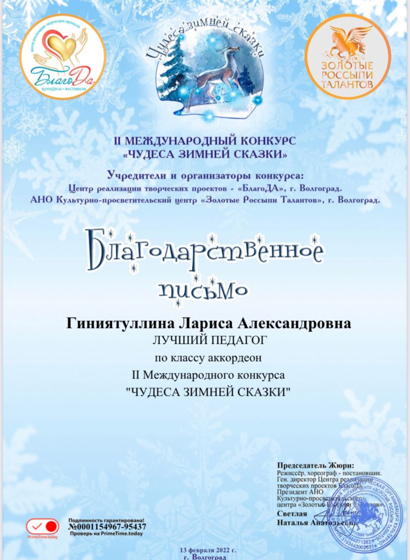 II Международный конкурс "Чудеса зимней сказки" - Диплом "Лучший преподаватель", Гиниятуллина Л.А.;