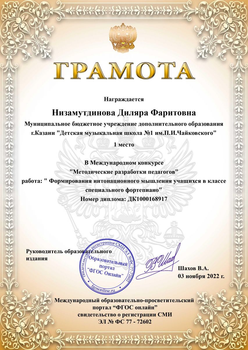 Международный конкурс "Методические разработки педагогов" - Низамутдинова Д.Ф., I место;