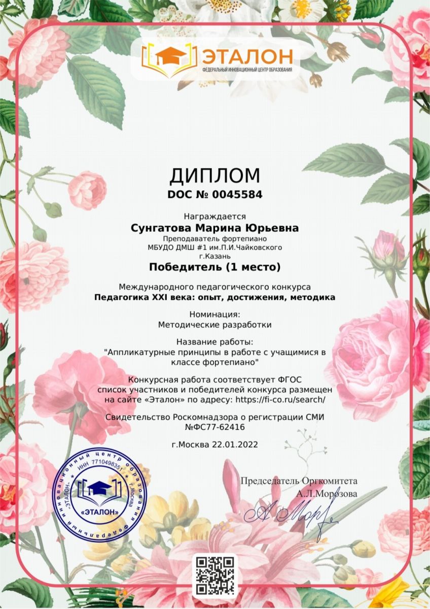 Международный педагогический конкурс"Педагогика XXI века" - Сунгатова М.Ю., Победитель I место;
