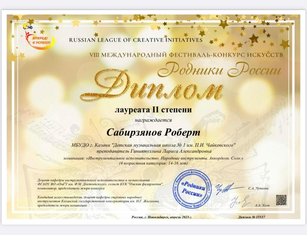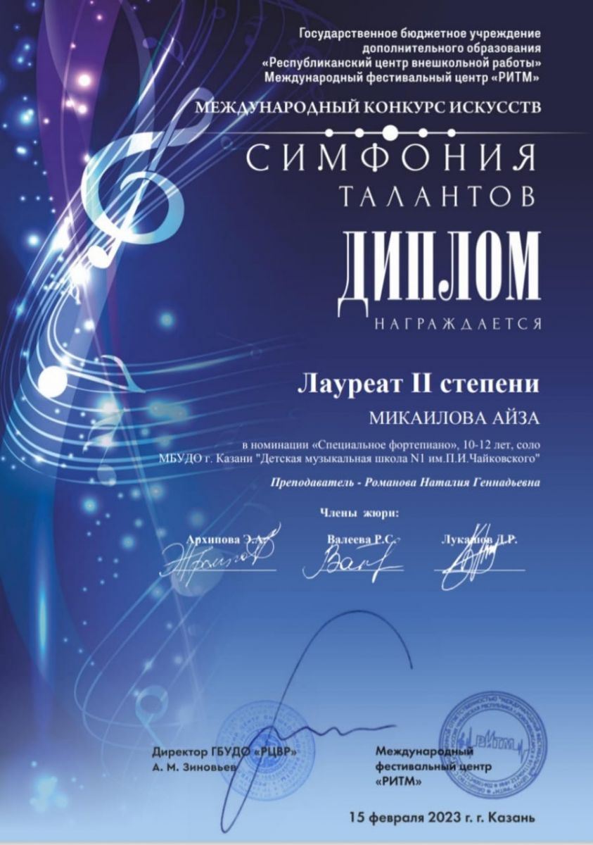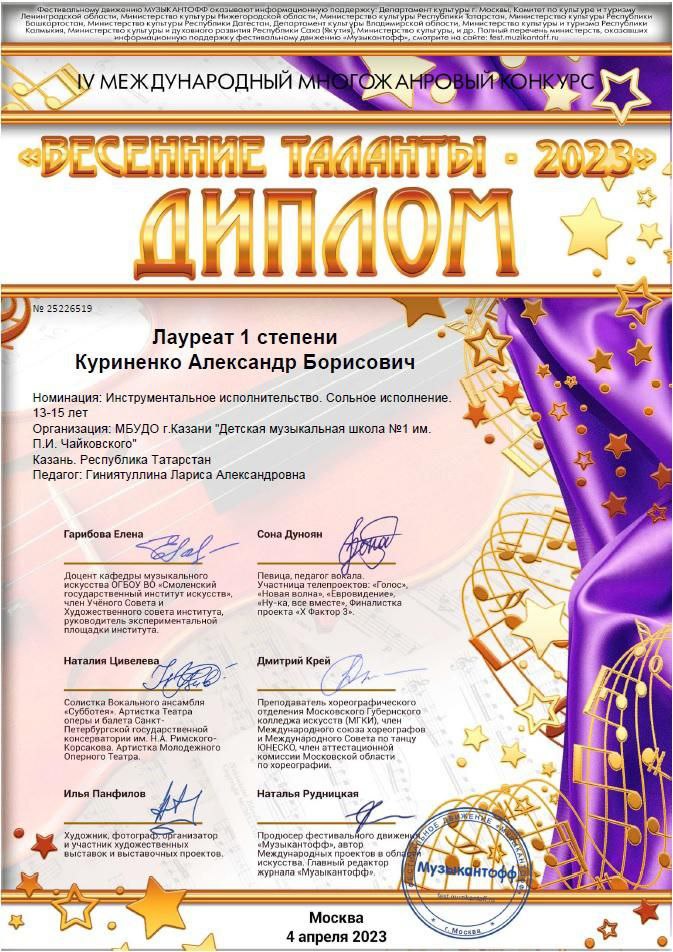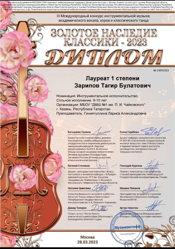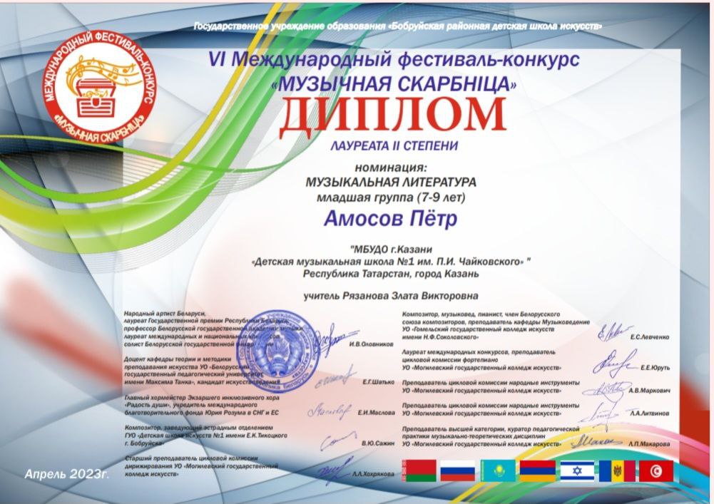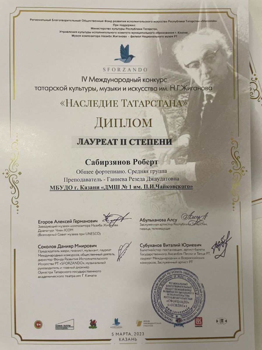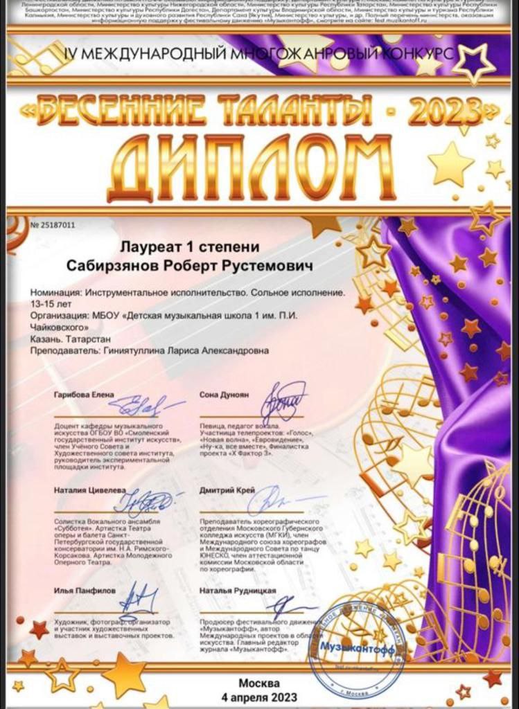 II Международный конкурс классического искусства "Симфония весны - 2023" - Канафиев Карим, Лауреат I степени, класс Исхакова Л.Н., концертмейстер Зубова О.Б.;
