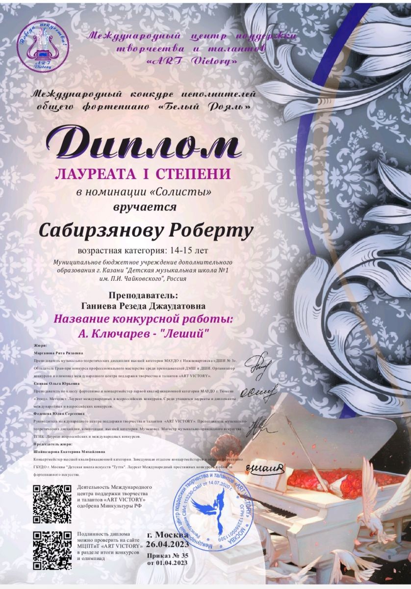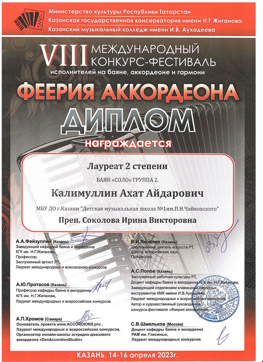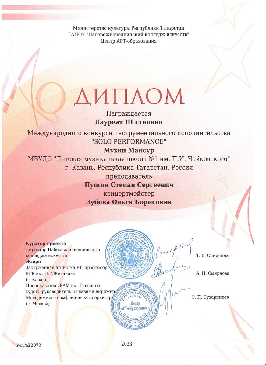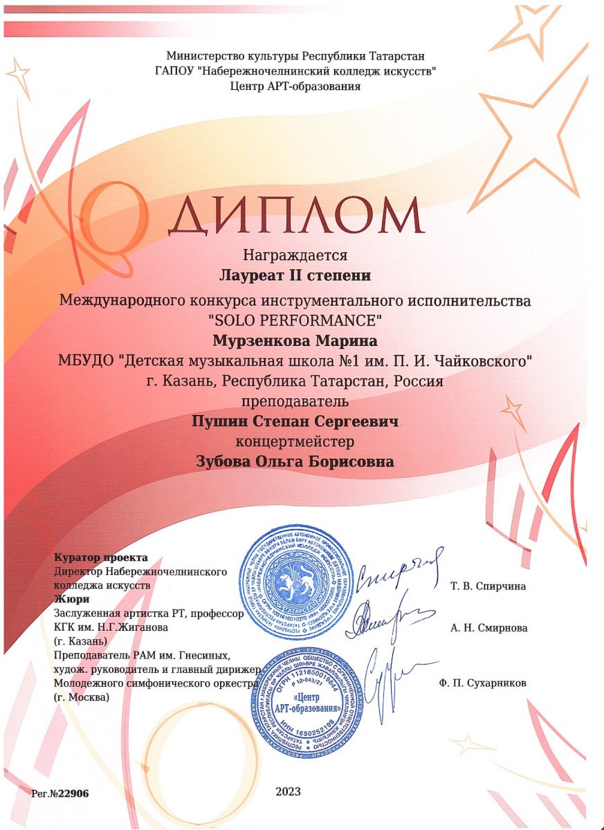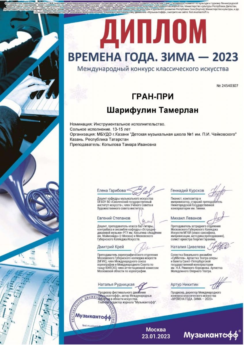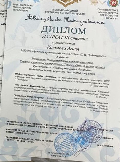 II Международный конкурс классического искусства "Симфония весны - 2023" - Канафиев Карим, Лауреат I степени, класс Исхакова Л.Н., концертмейстер Зубова О.Б.;