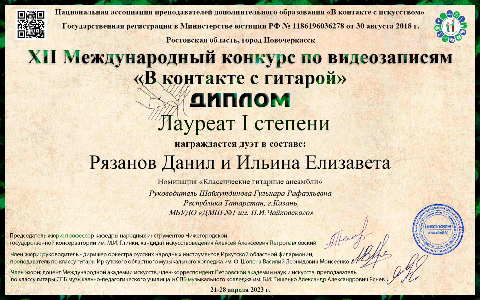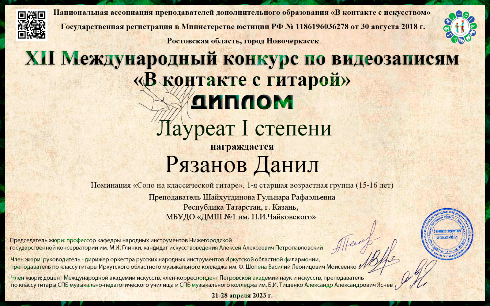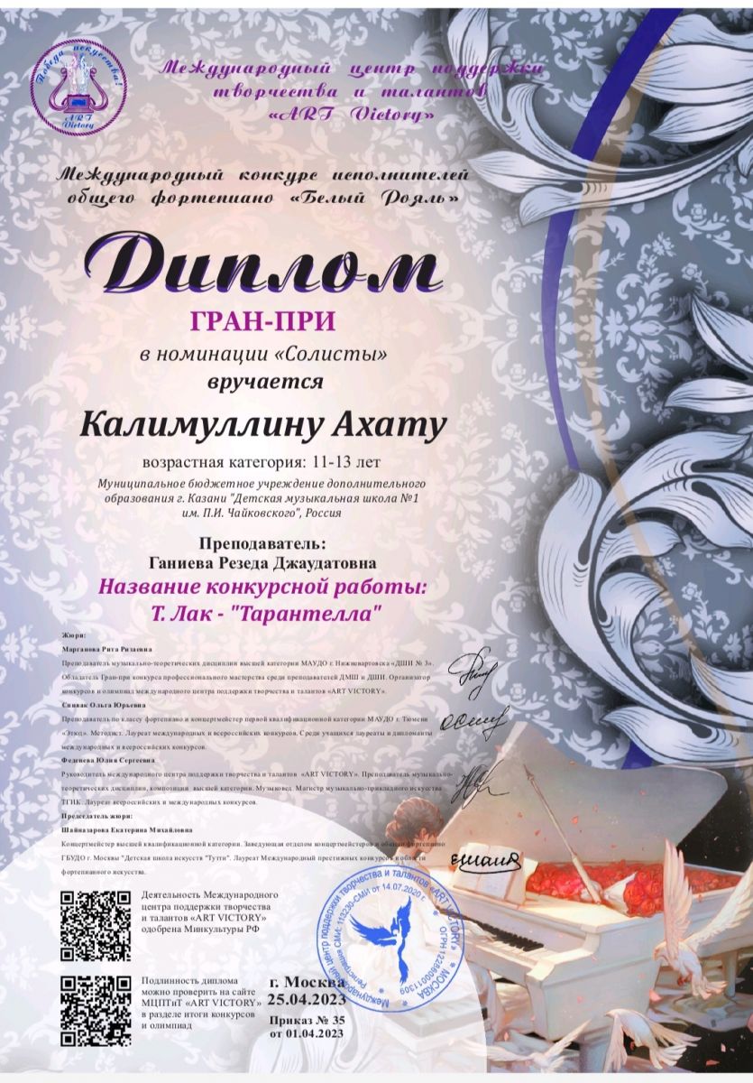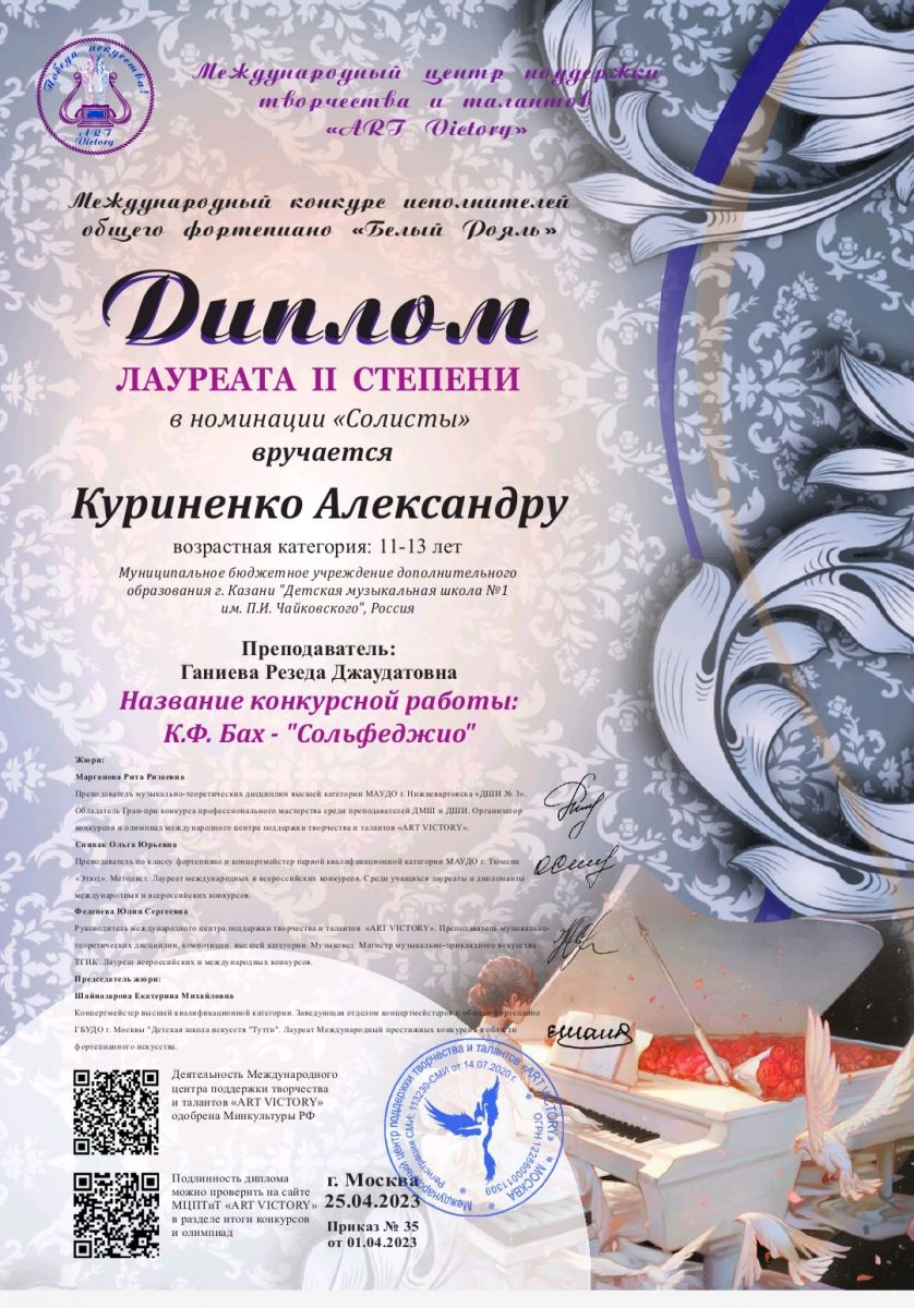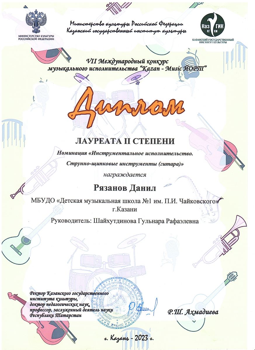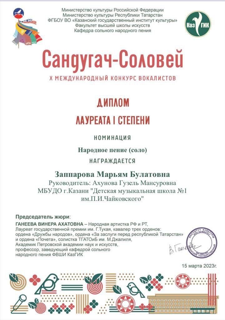 II Международный конкурс классического искусства "Симфония весны - 2023" - Канафиев Карим, Лауреат I степени, класс Исхакова Л.Н., концертмейстер Зубова О.Б.;