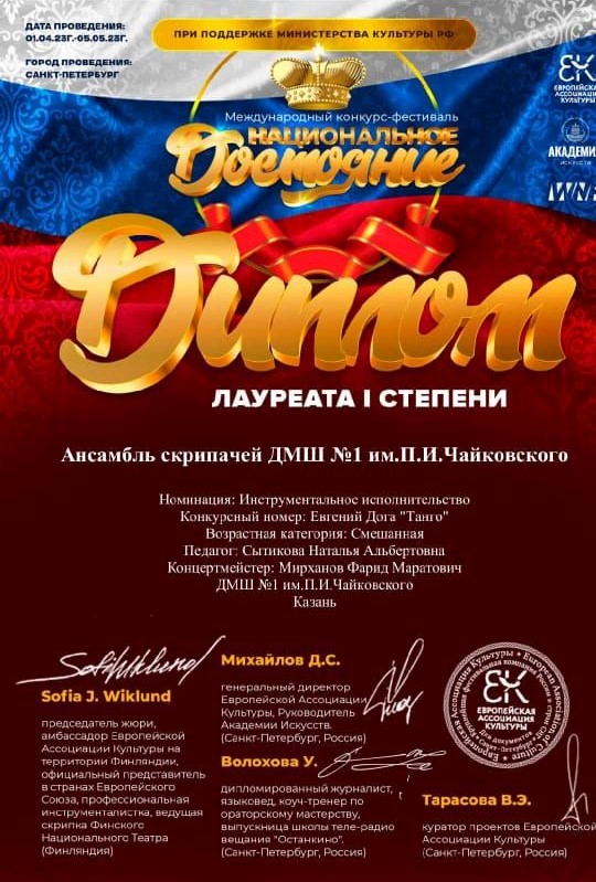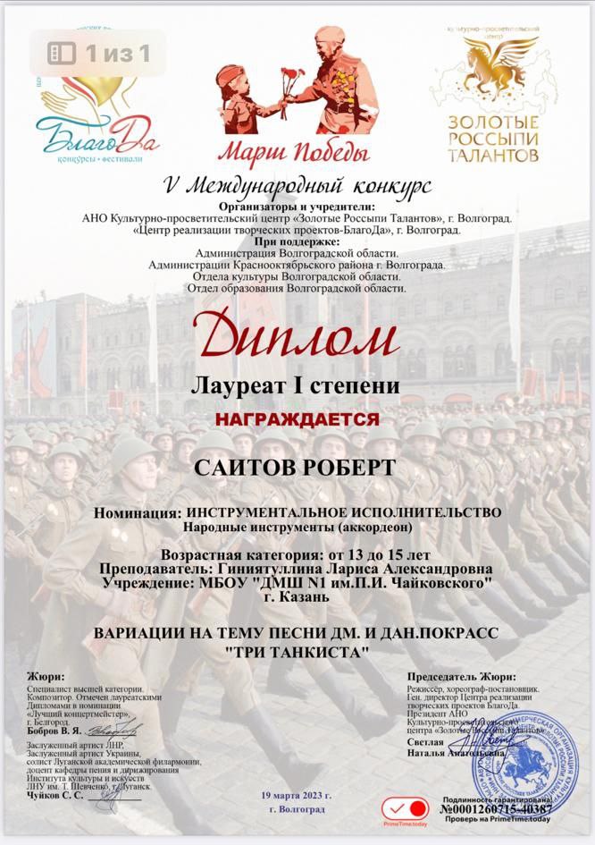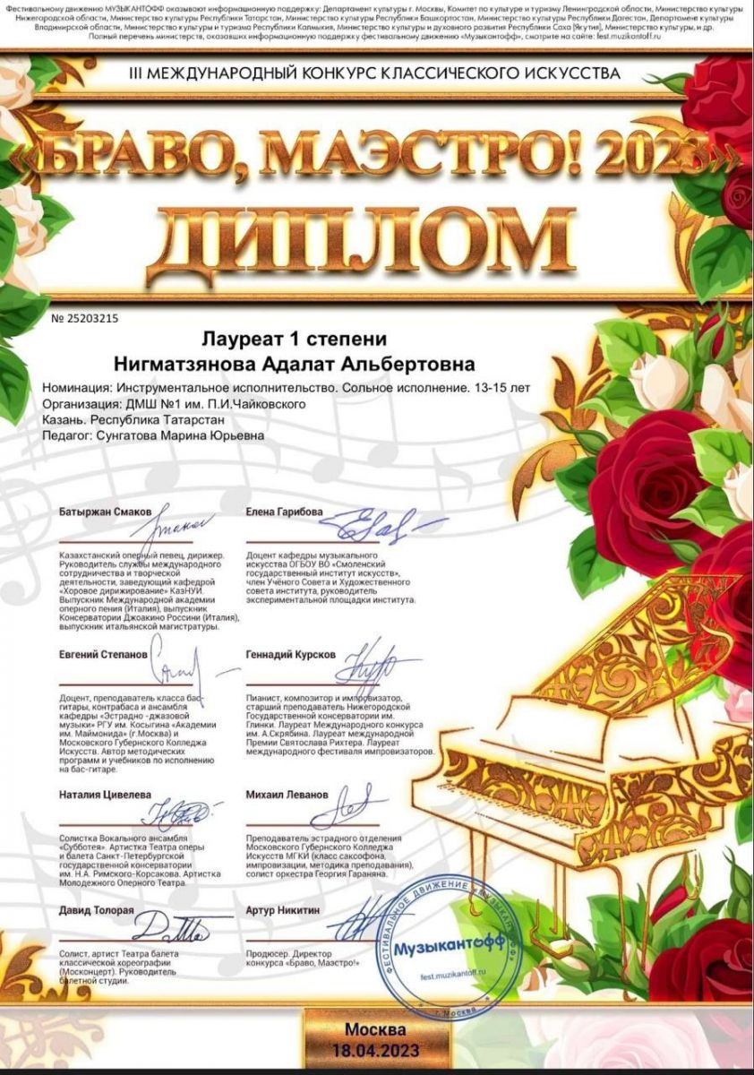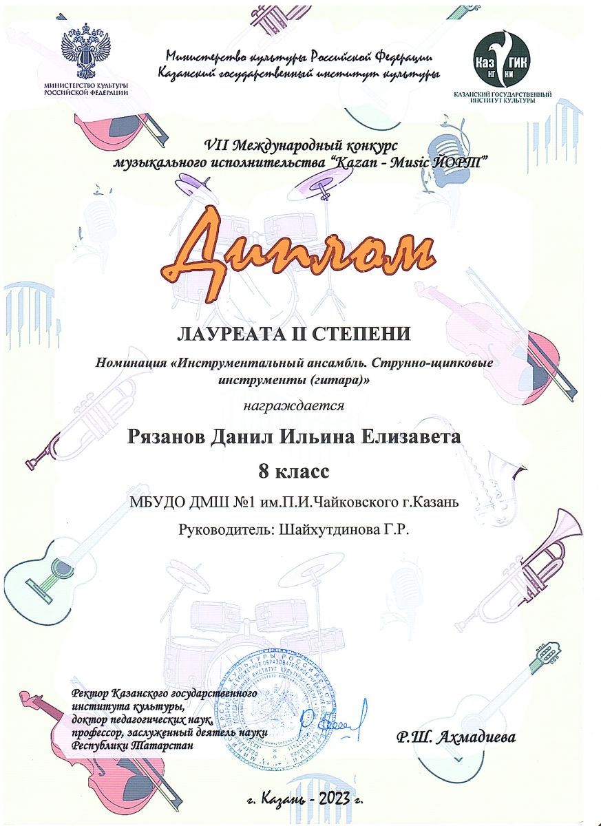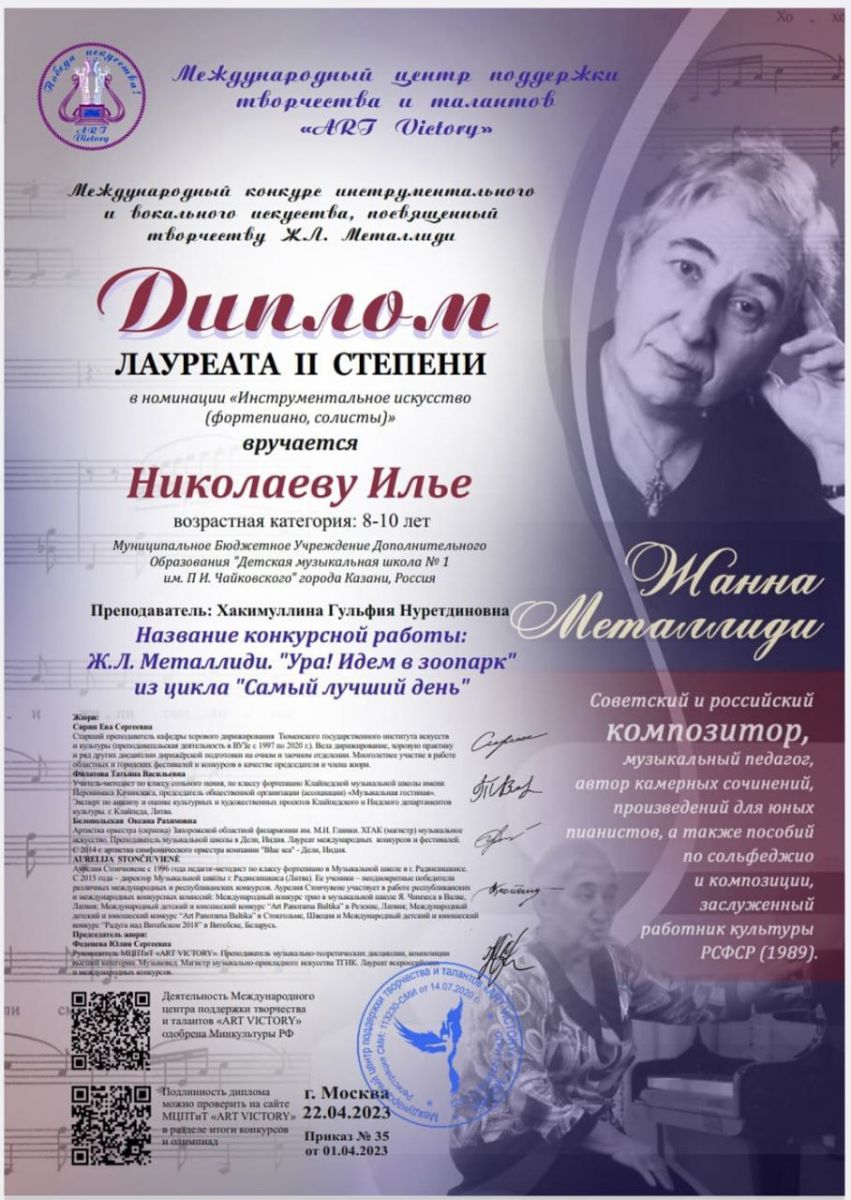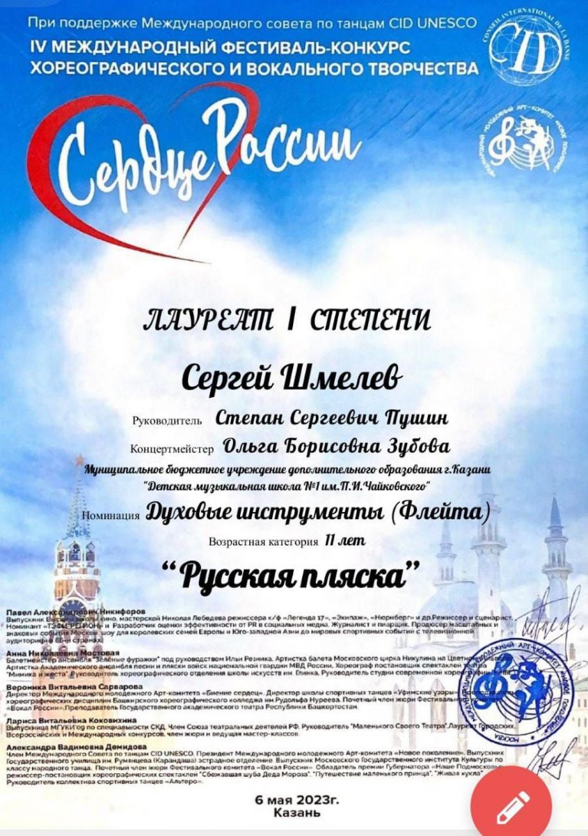 II Международный конкурс классического искусства "Симфония весны - 2023" - Канафиев Карим, Лауреат I степени, класс Исхакова Л.Н., концертмейстер Зубова О.Б.;