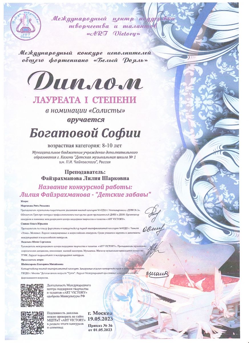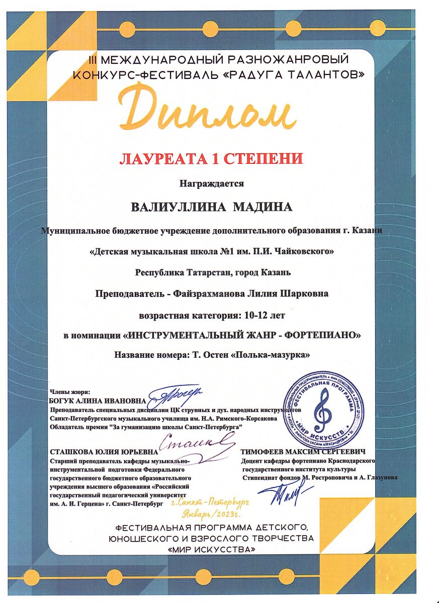 Международный конкурс искусств "Радуга талантов" - Богатова София, Лауреат I степени, класс Файзрахмановой Л.Ш.;