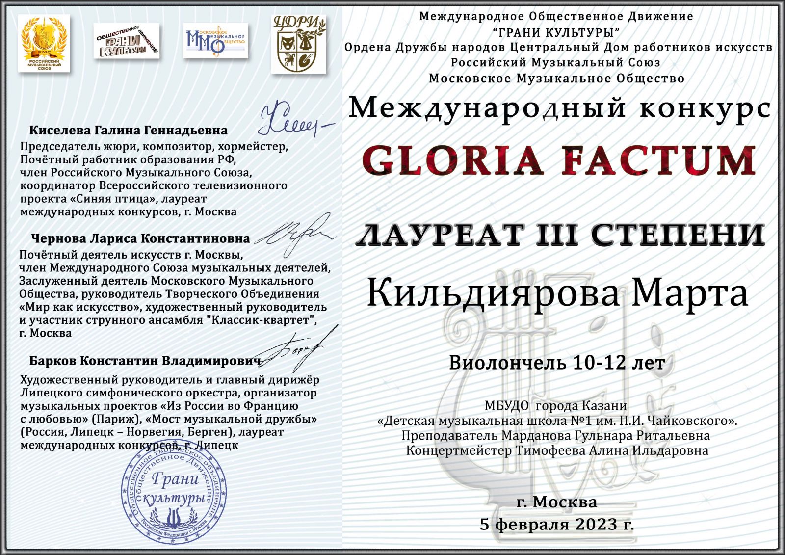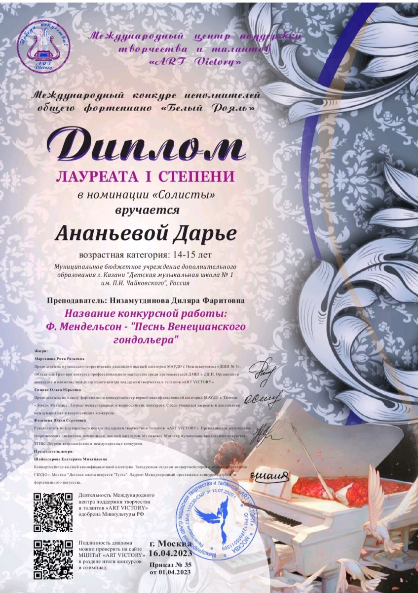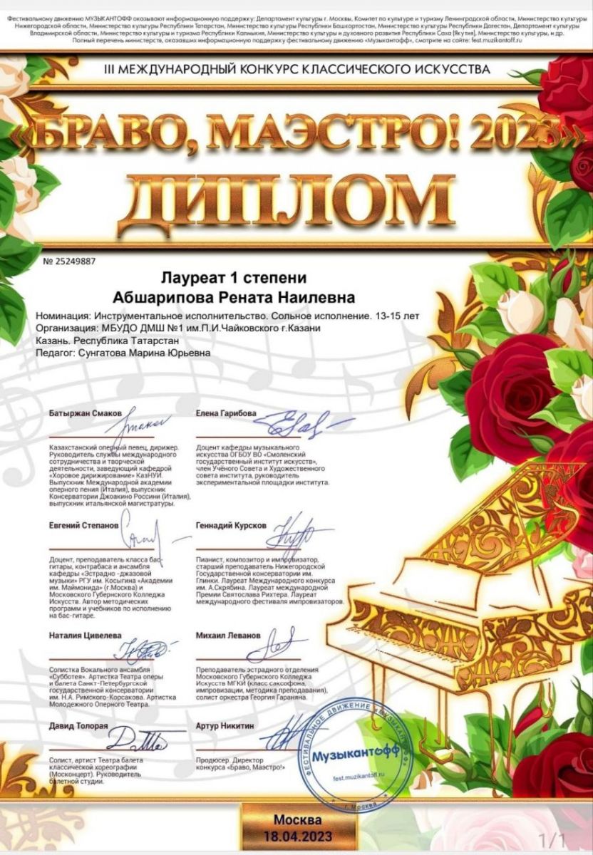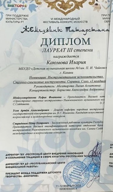 Международный конкурс "Pro Искусство" - Абайдуллина Марьям, Лауреат III степени, класс Сунгатовой М.Ю.;