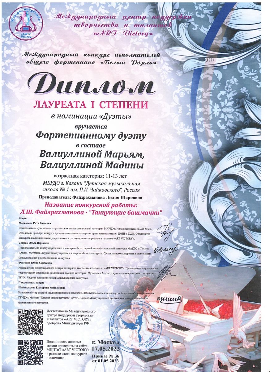 Международный конкурс искусств "Радуга талантов" - Валиуллины Марьям и Мадина, Лауреаты I степени, класс Файзрахмановой Л.Ш.;