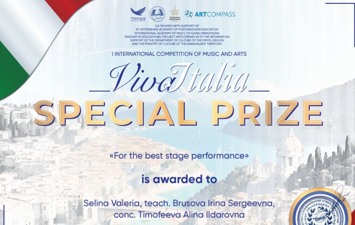 I Международный конкурс музыки и искусств "Viva Italia" - Селина Валерия, Специальный приз, класс Брусовой И.С., концертмейстер Тимофеева А.И.;