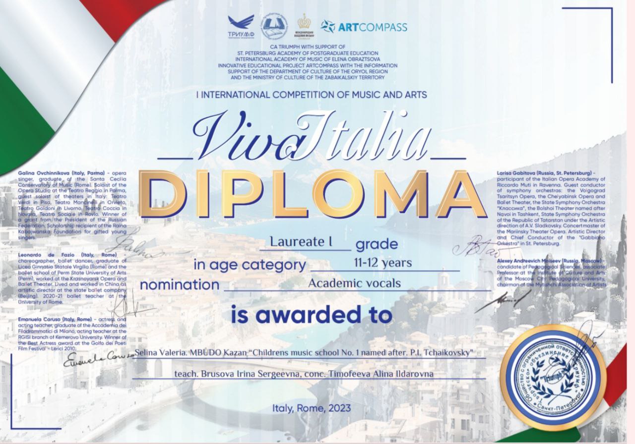 I Международный конкурс музыки и искусств "Viva Italia" - Селина Валерия, Лауреат I степени, класс Брусовой И.С., концертмейстер Тимофеева А.И.;