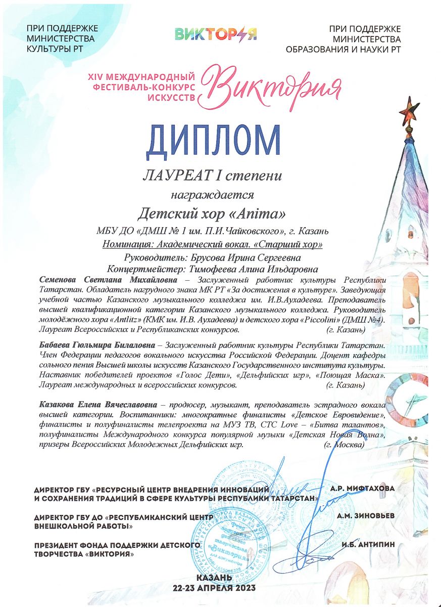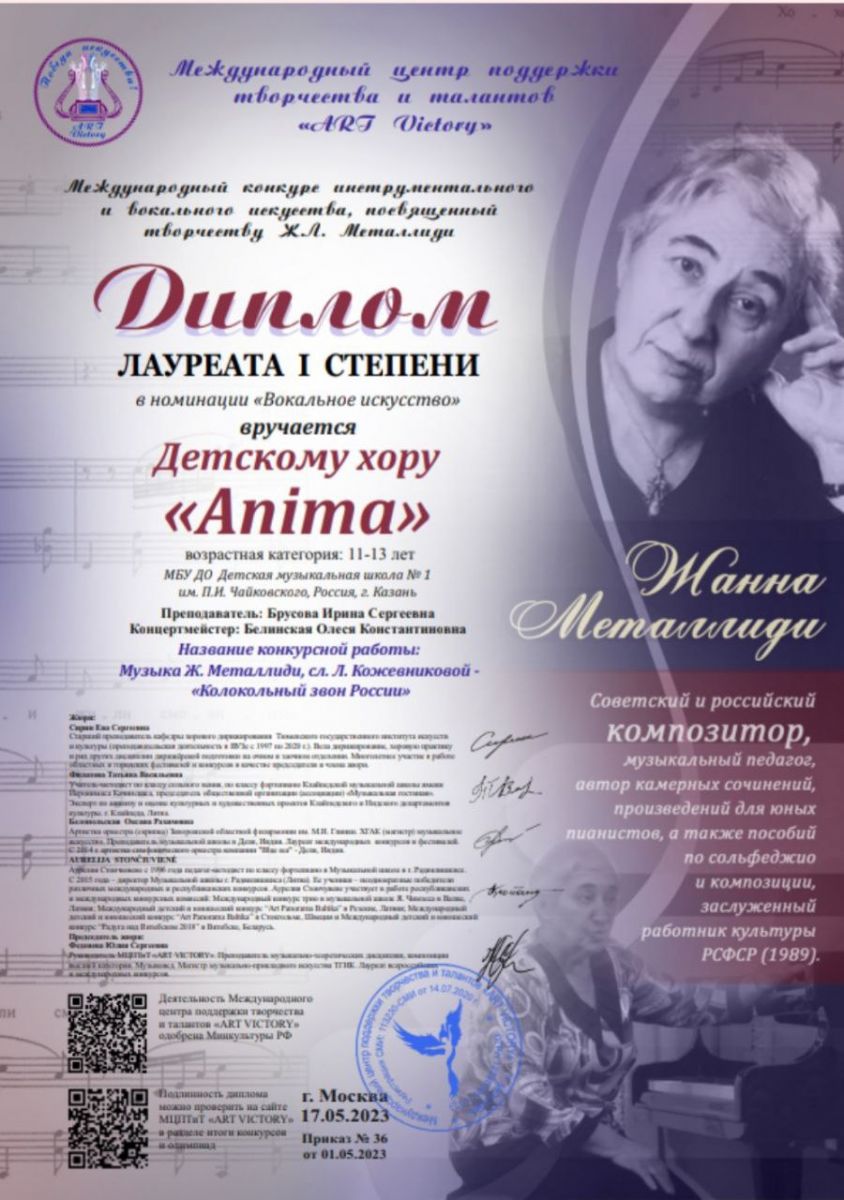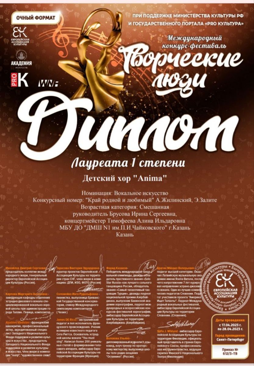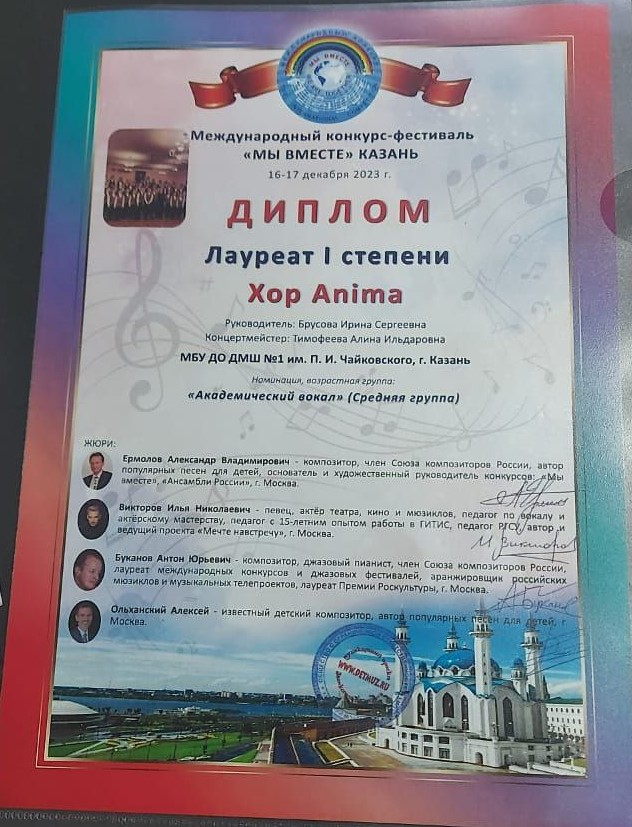 Международный конкурс-фестиваль  "Мы вместе" - Хор "Anima", Лауреат I степени, рук. Брусова И.С., концертмейстер Тимофеева А.И.;