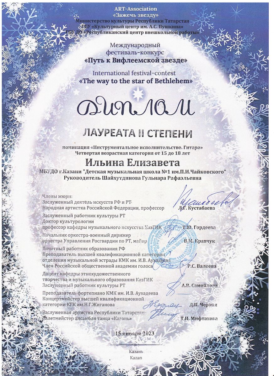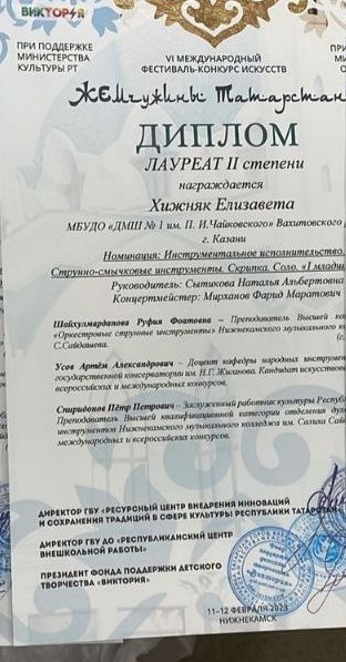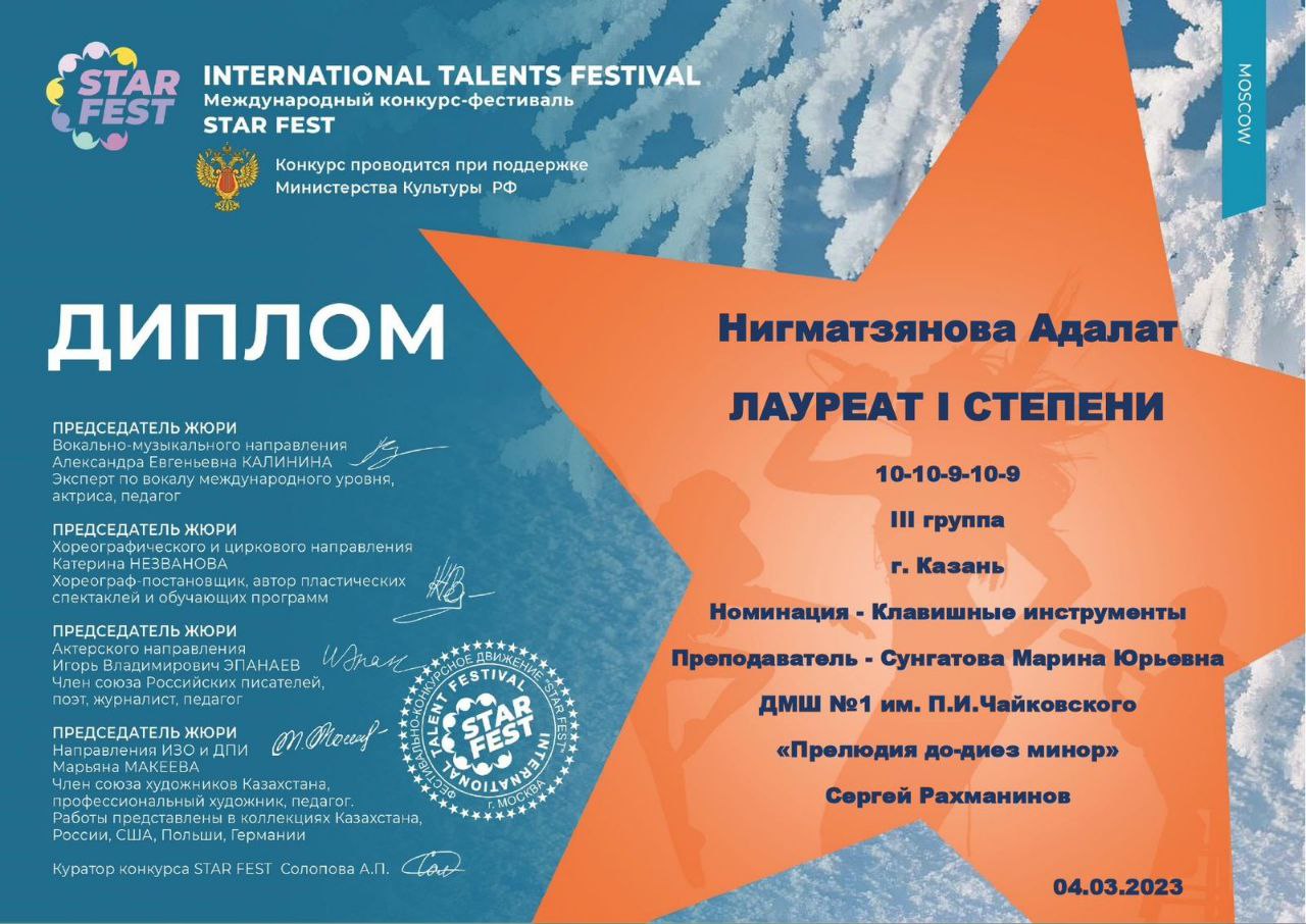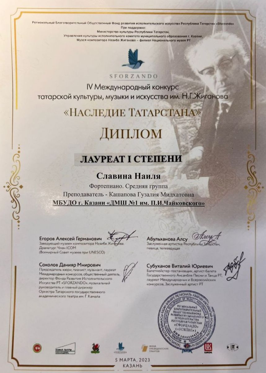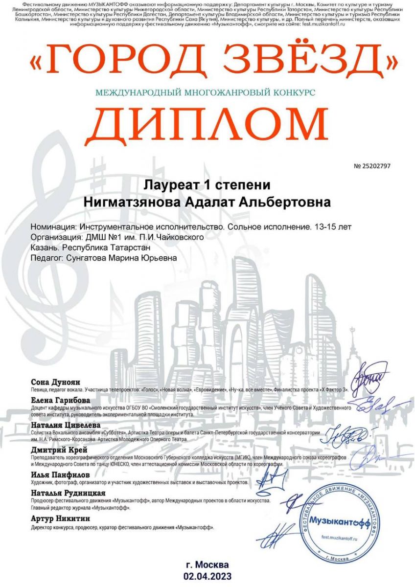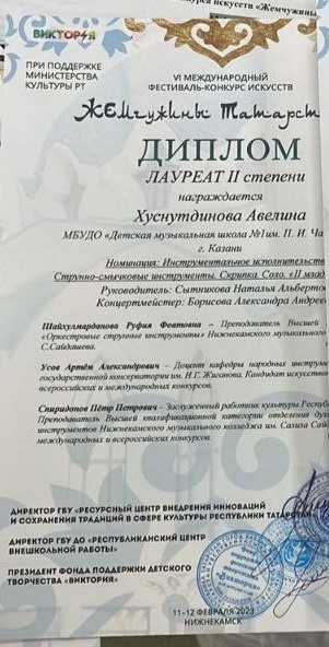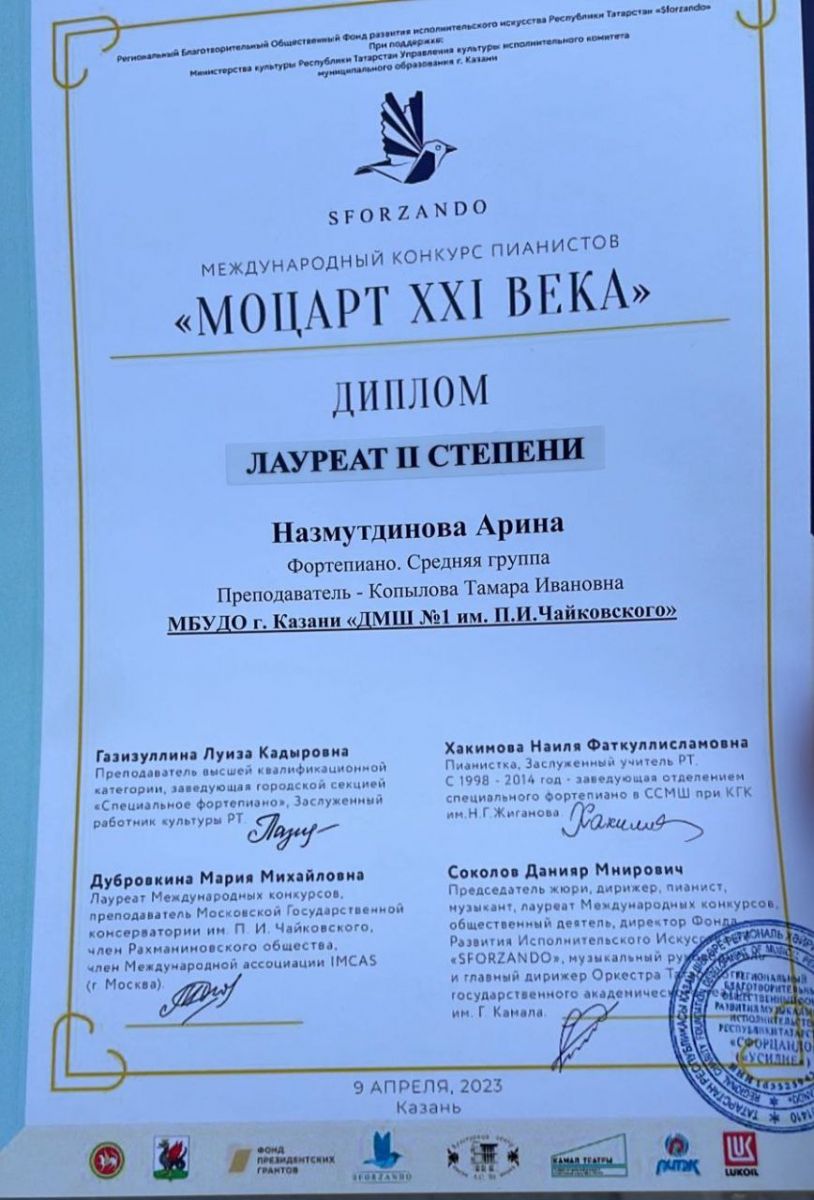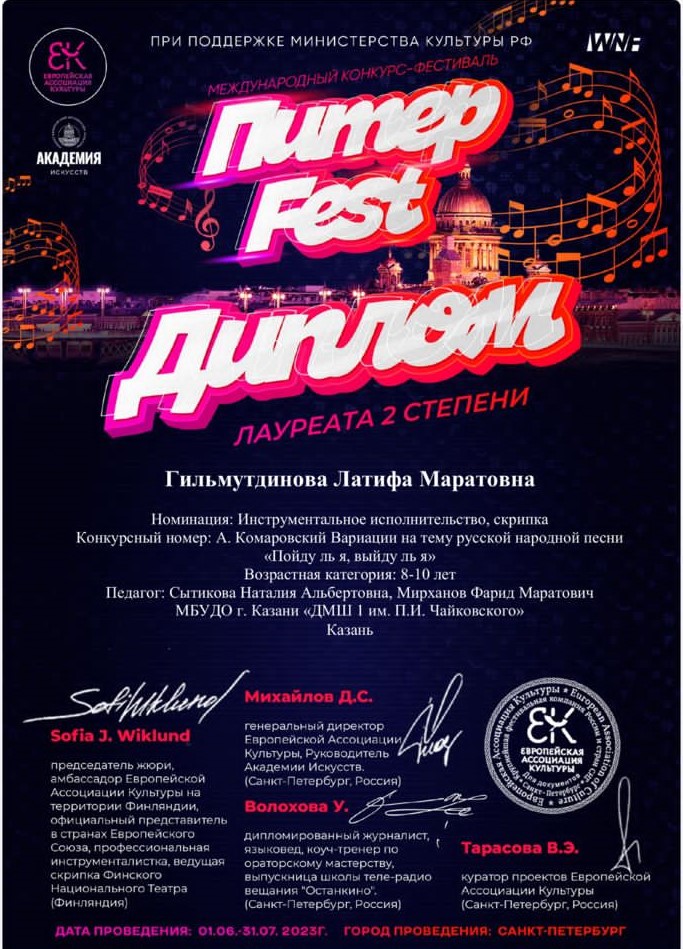 Международный конкурс-фестиваль "Питер Fest" - Гильмутдинова Латифа, Лауреат II степени, класс Сытиковой Н.А., концертмейстер Мирханов Ф.М.;