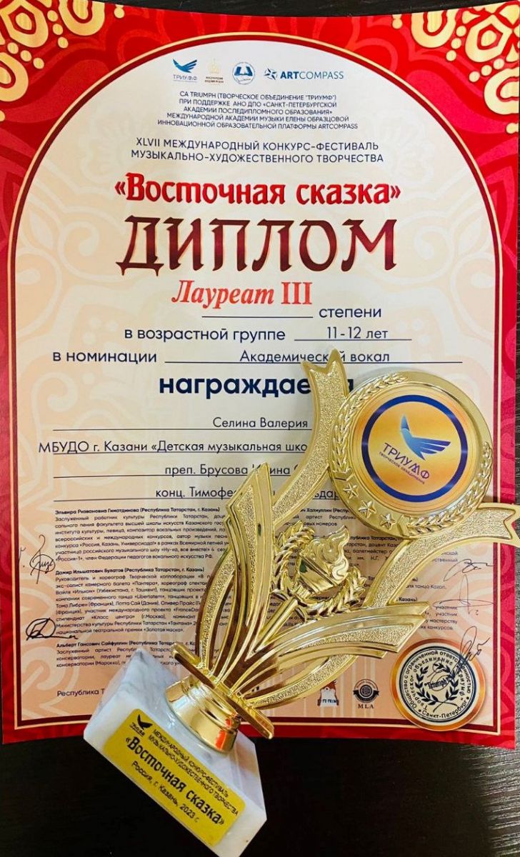 XLVII Международный конкурс-фестиваль музыкально-художественного творчества "Восточная сказка" - Селина Валерия, Лауреат III степени, класс Брусовой И.С., концертмейстер Тимофеева А.И.;