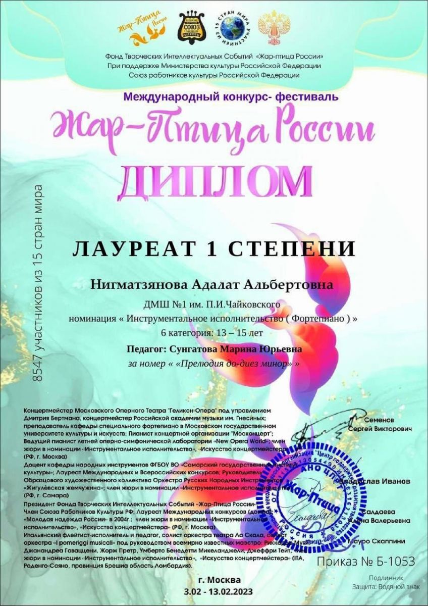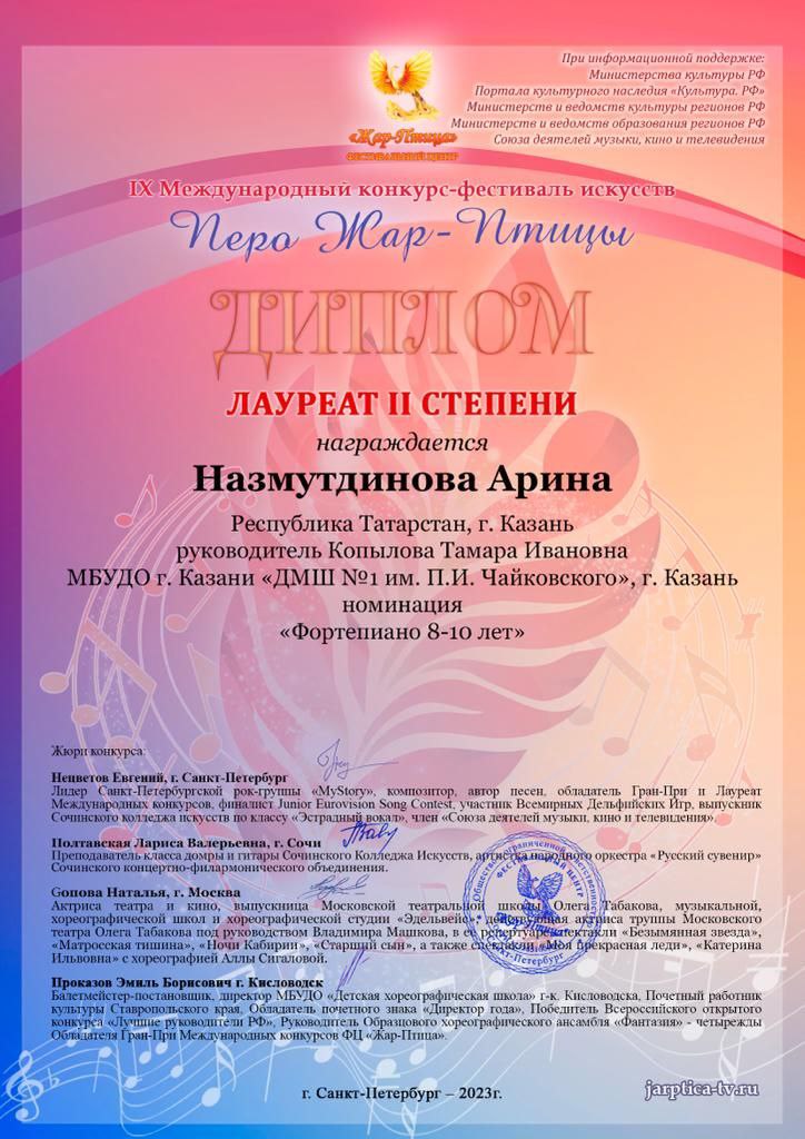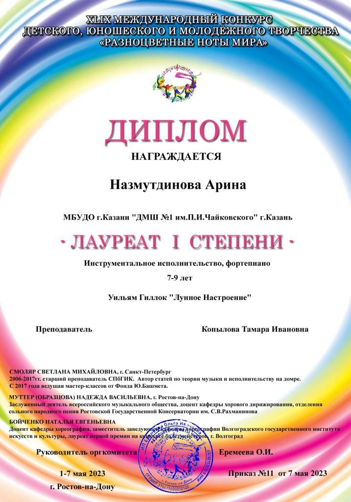 XLIX Международный конкурс детского, юношеского и молодёжного творчества "Разноцветные ноты мира" - Назмутдинова Арина, Лауреат I степени, класс Копыловой Т.И.;
