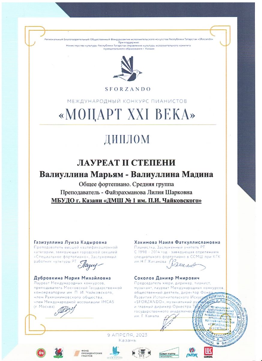 Международный конкурс инструментального и вокального искусства, посвящённый творчеству В.А.Моцарта - Мартынюк Мария и Романова Мария, Лауреаты I степени, преп. Пушин С.С., Хакимуллина Г.Н.;