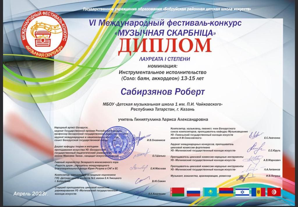 VIII Меңдународный фестивалҗ-конкурс искусств "Родники России" - Сабирзянов Роберт, Лауреат II степени, класс Гиниятуллиной Л.А.;