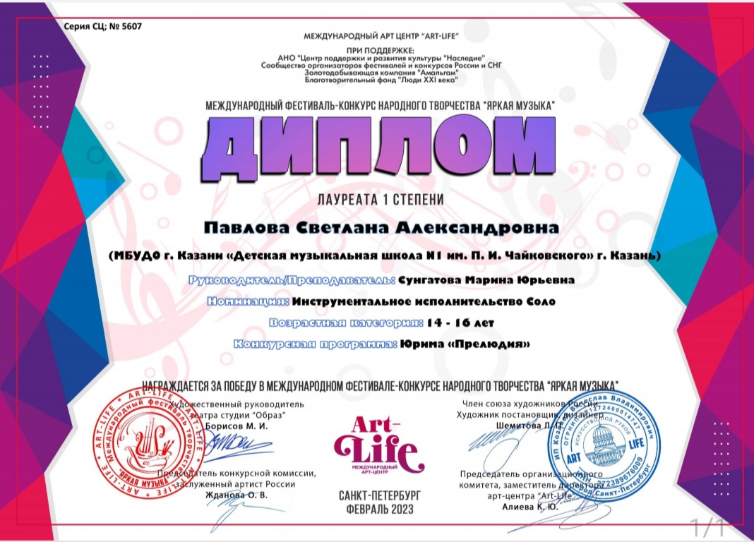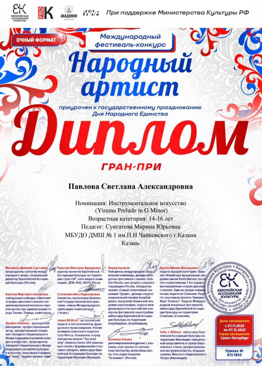 Международный фестиваль-конкурс "Народный артист" - Павлова Светлана, Гран-При, класс Сунгатовой М.Ю.;