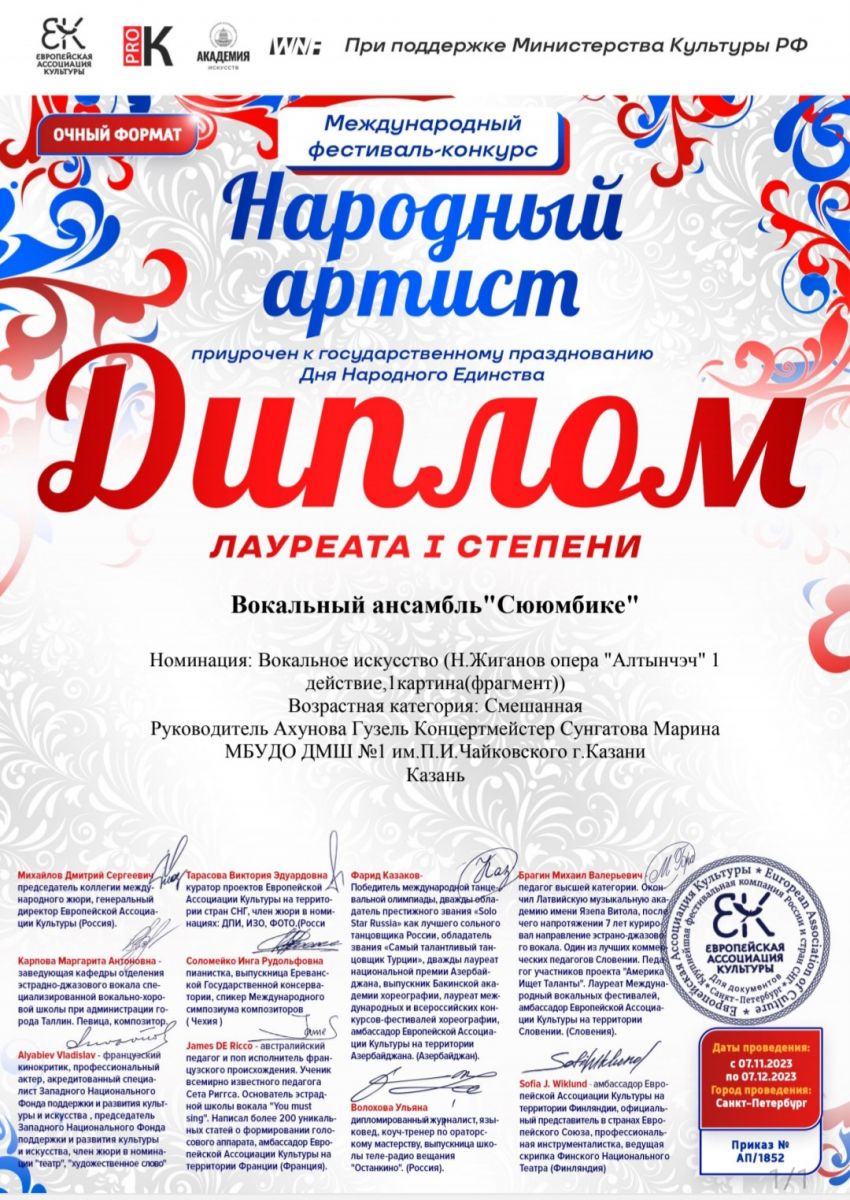 Международный фестиваль-конкурс "Народный артист" - Ансамбль "Сююмбике", Лауреат I степени, рук. Ахунова Г.М., концертмейстер Сунгатова М.Ю.;