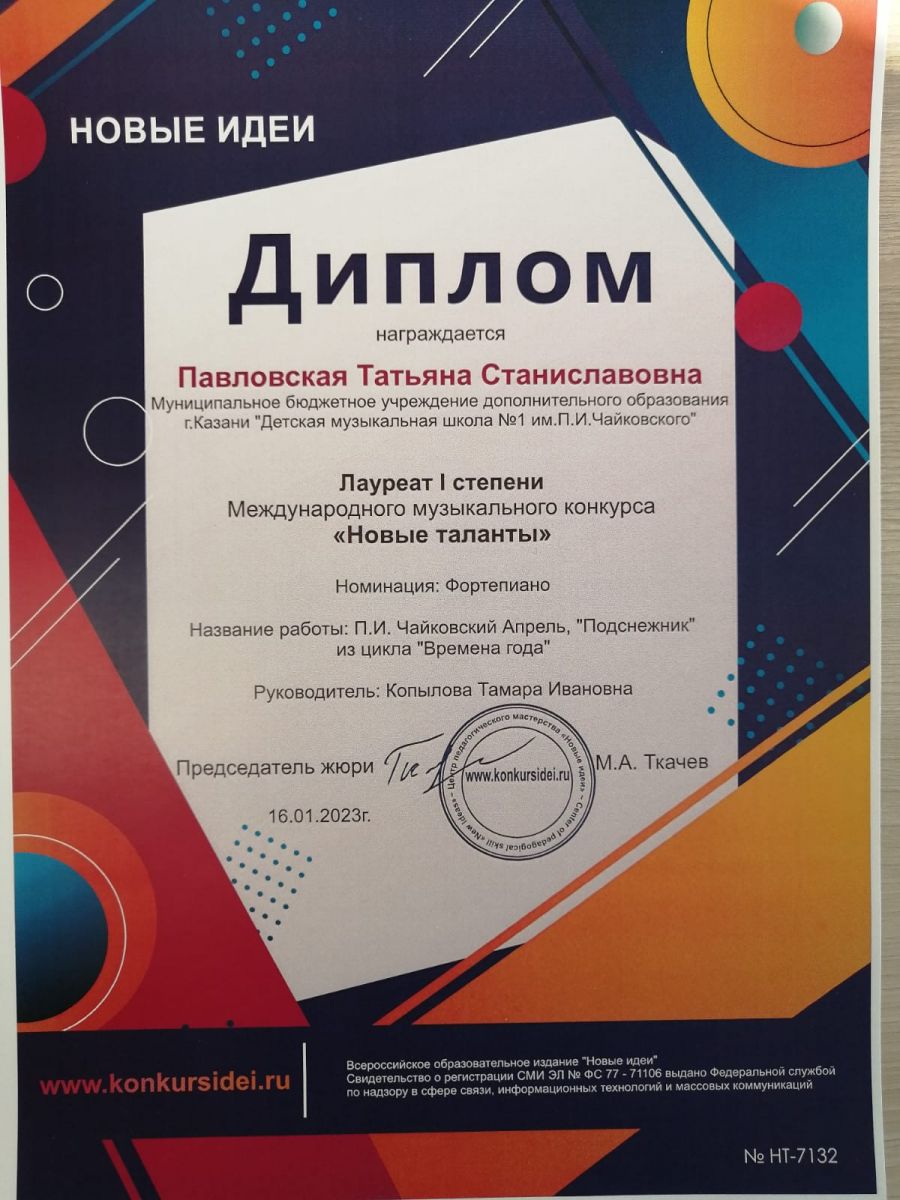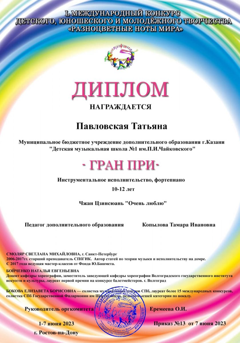 L Международный конкурс детского, юношеского и молодёжного творчества "Разноцветные ноты мира" - Павловская Татьяна, Гран При, класс Копыловой Т.И.;