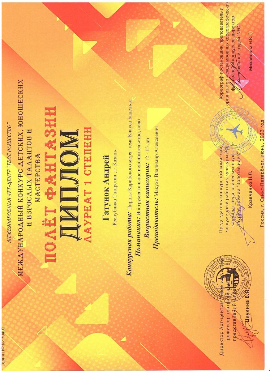 Международный конкурс детских, юношеских и взрослых талантов и мастерства "Полёт фантазии" - Гатунок Андрей, Лауреат I степени, класс Макухо В.А., концертмейстер Мирханов Ф.М.;