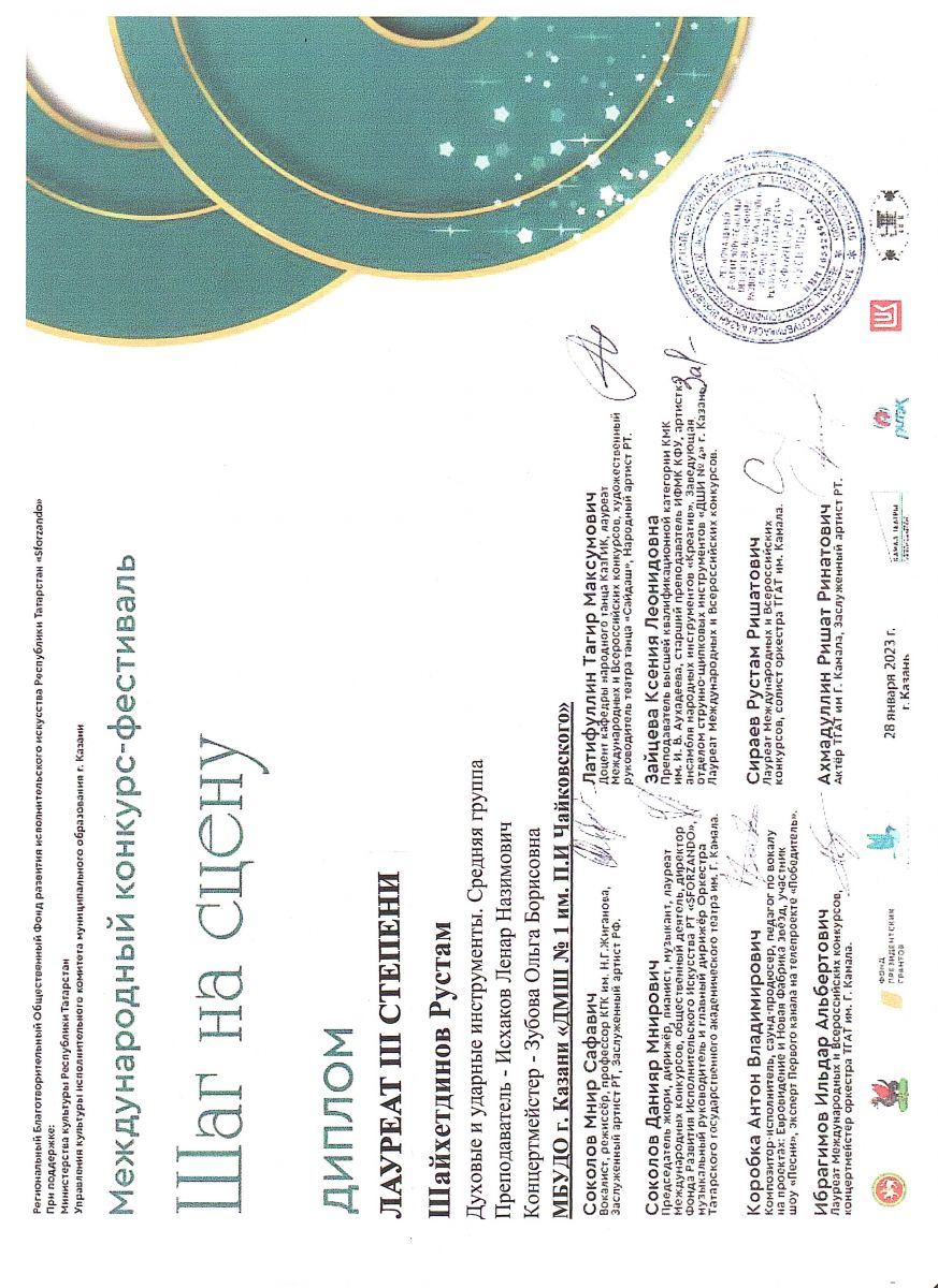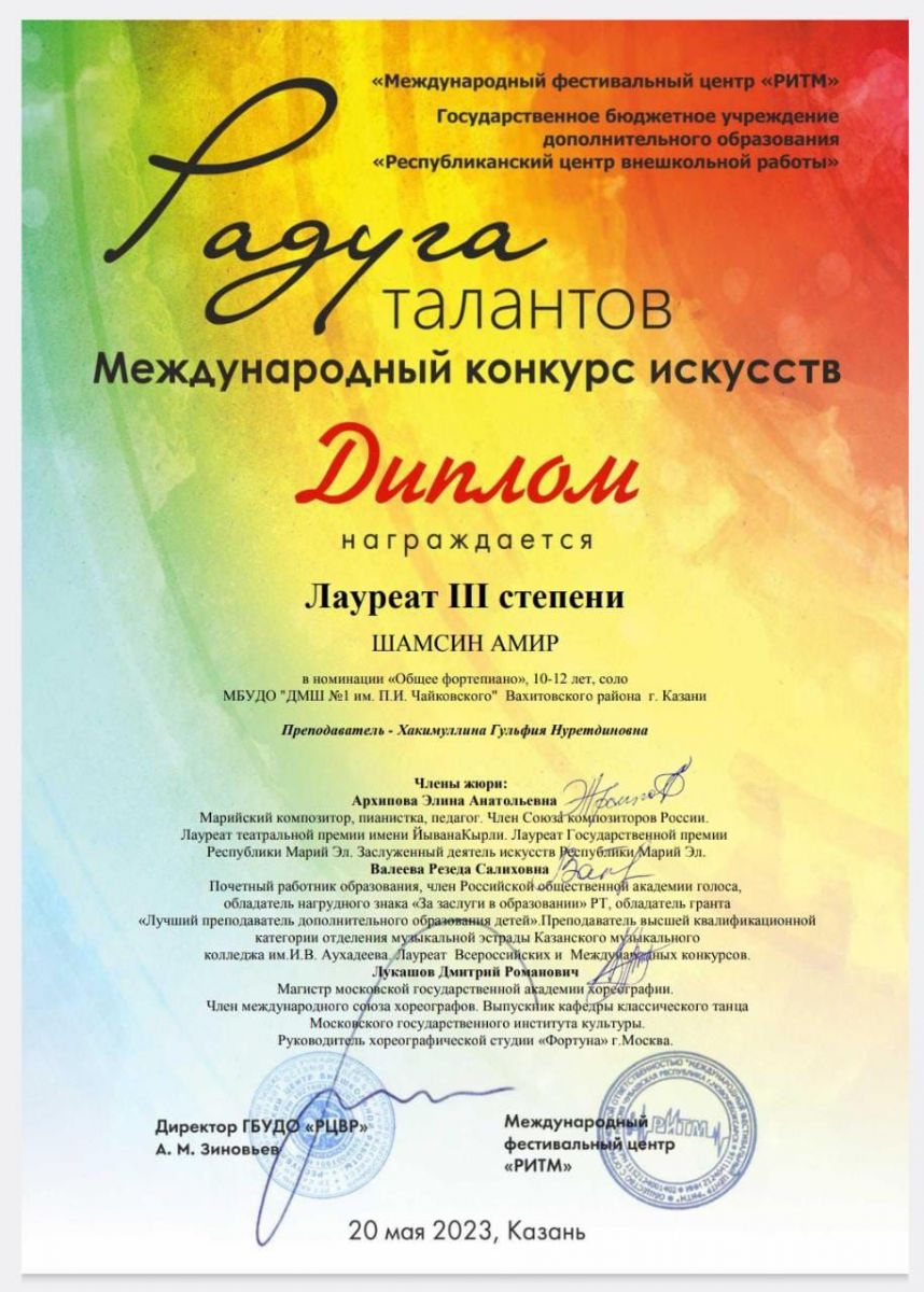 Международный конкурс искусств "Радуга талантов" - Шамсин Амир, Лауреат III степени, класс Хакимуллиной Г.Н.;