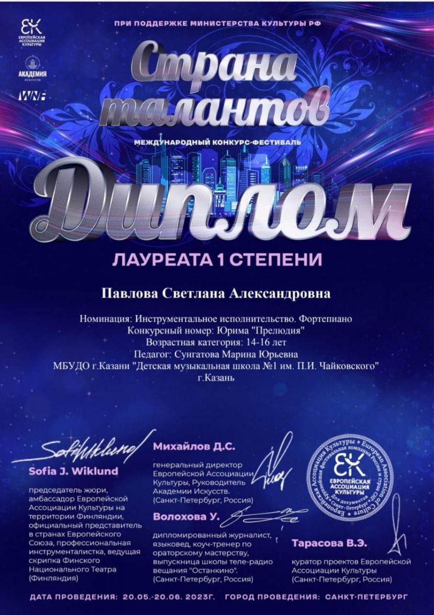 Международный конкурс-фестиваль "Страна талантов" - Павлова Светлана, Лауреат I  степени, класс Сунгатовой М.Ю.;