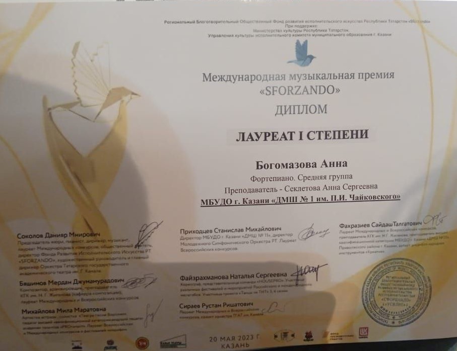 Международная музыкальная премия "SFORZANDO" - Богомазова Анна, Лауреат I степени, класс Секлетовой А.С.;