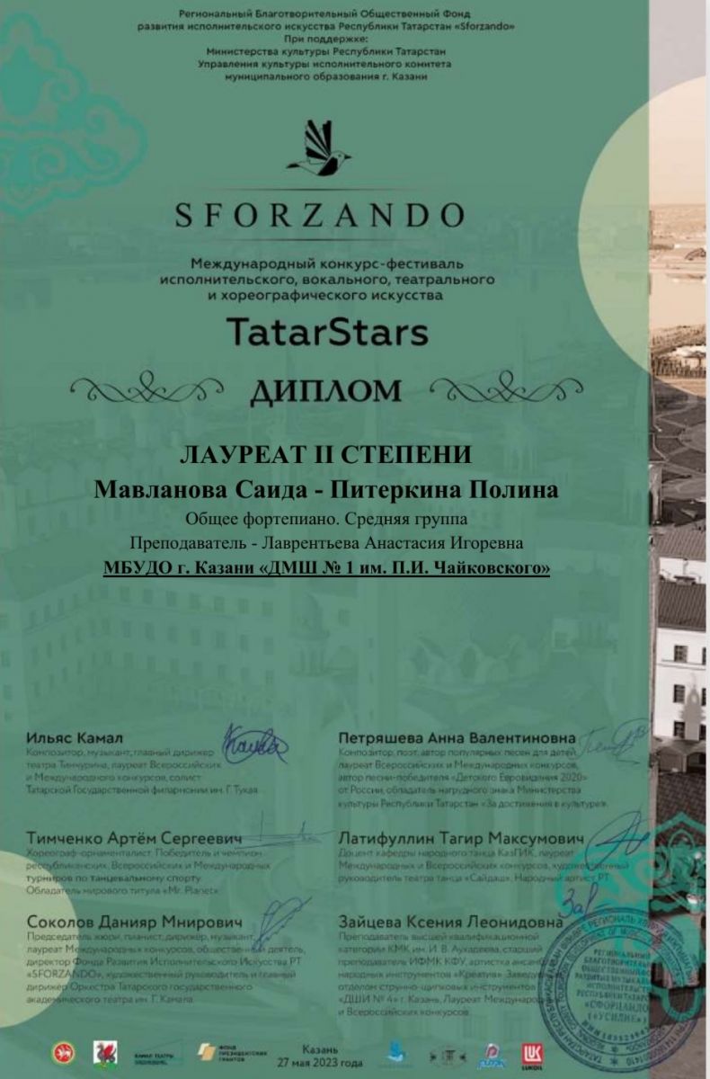 Международный конкурс-фестиваль исполнительского, вокального, театрального и хореографического искусства "TatarStars" - Мавланова Саида и Питеркина Полина, Лауреаты II степени, класс Лаврентьевой А.И.;