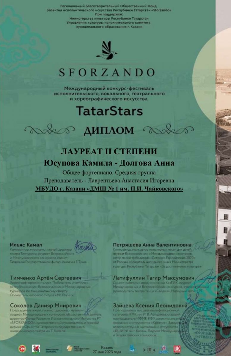 Международный конкурс-фестиваль исполнительского, вокального, театрального и хореографического искусства "TatarStars" - Юсупова Камила и Долгова Анна, Лауреаты II степени, класс Лаврентьевой А.И.;