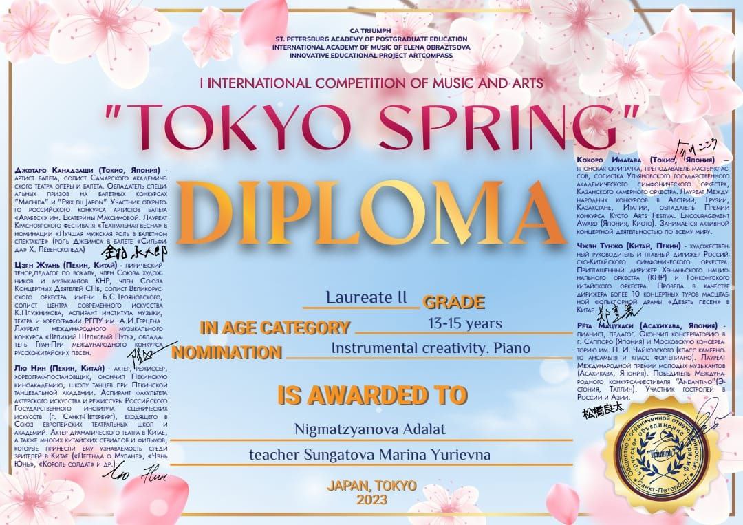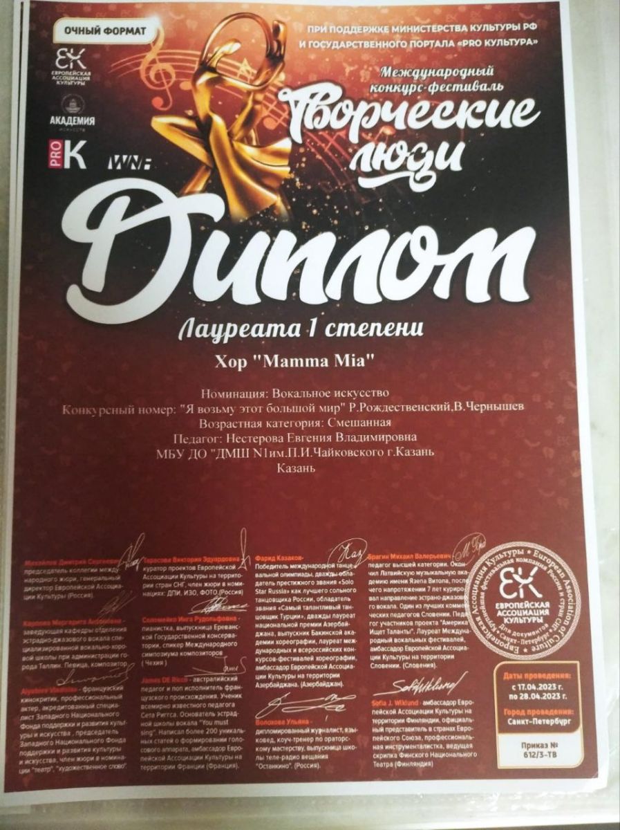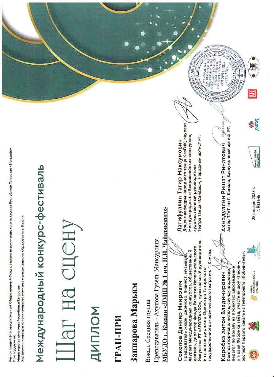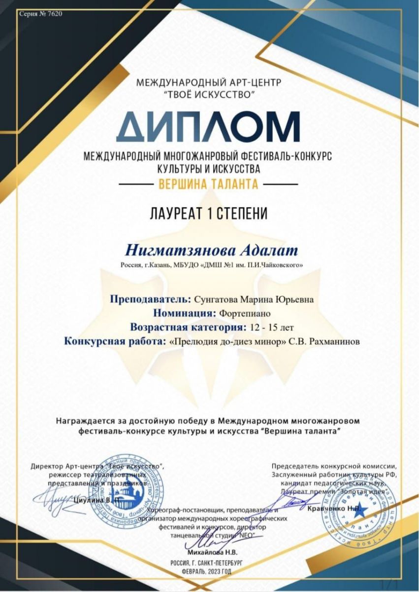 Международный фестиваль-конкурс "Народный артист" - Нигматзянова Адалат, Гран-При, класс Сунгатовой М.Ю.;